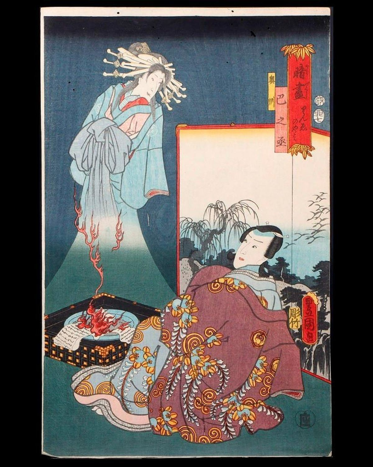 Artist : Kunisada UTAGAWA, Toyokuni III (1786-1865) Series : Ghosts. Date : (c.1860s) Medium: Woodblock Dimensions : 15 x 10 1/4 in. Condition : Overall good, light fading, and small wormholes.