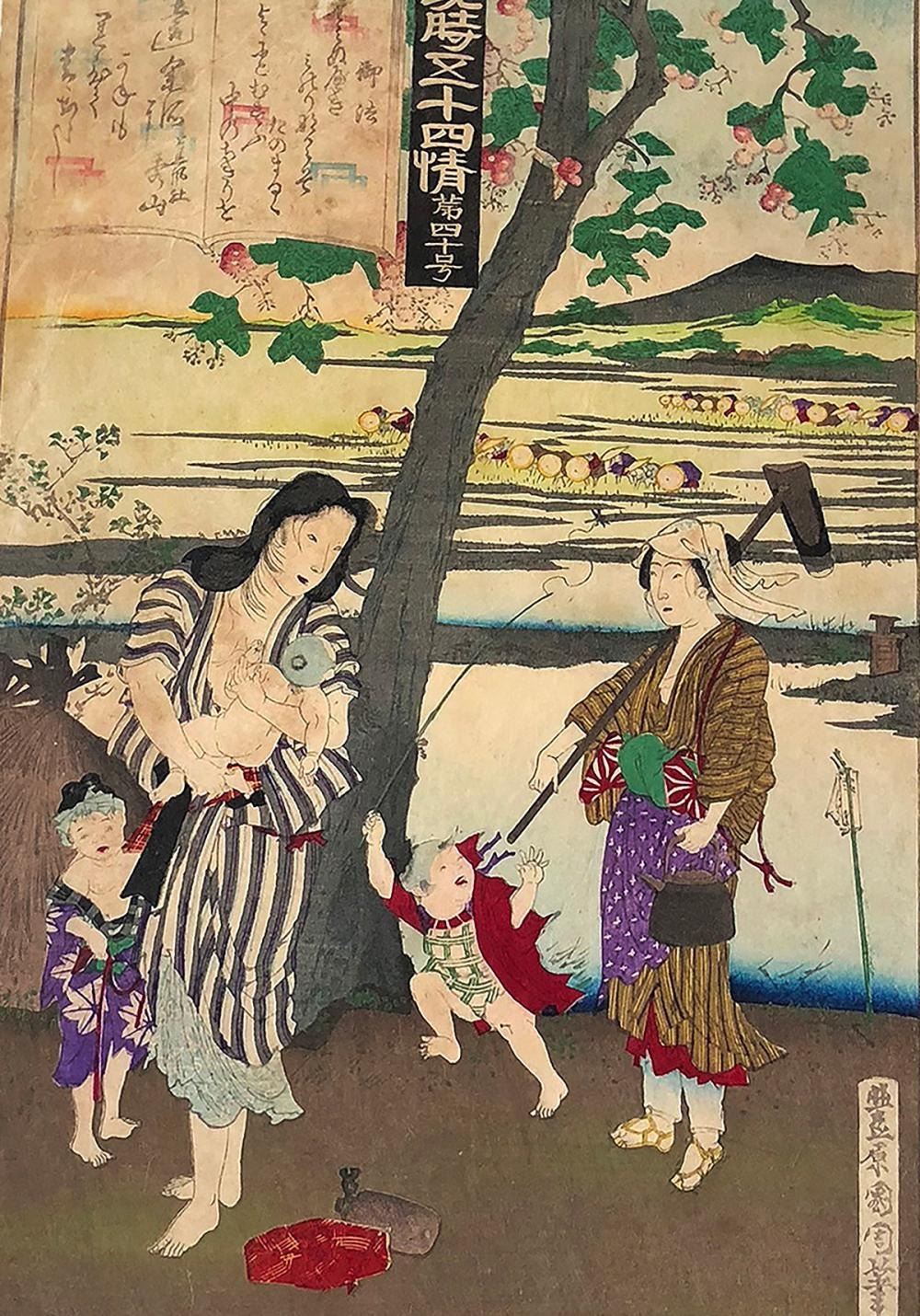 Kunisada - "Women with Kids" - Japanese Woodblock Print, some aging, otherwise fine condition, 13.5 x 9