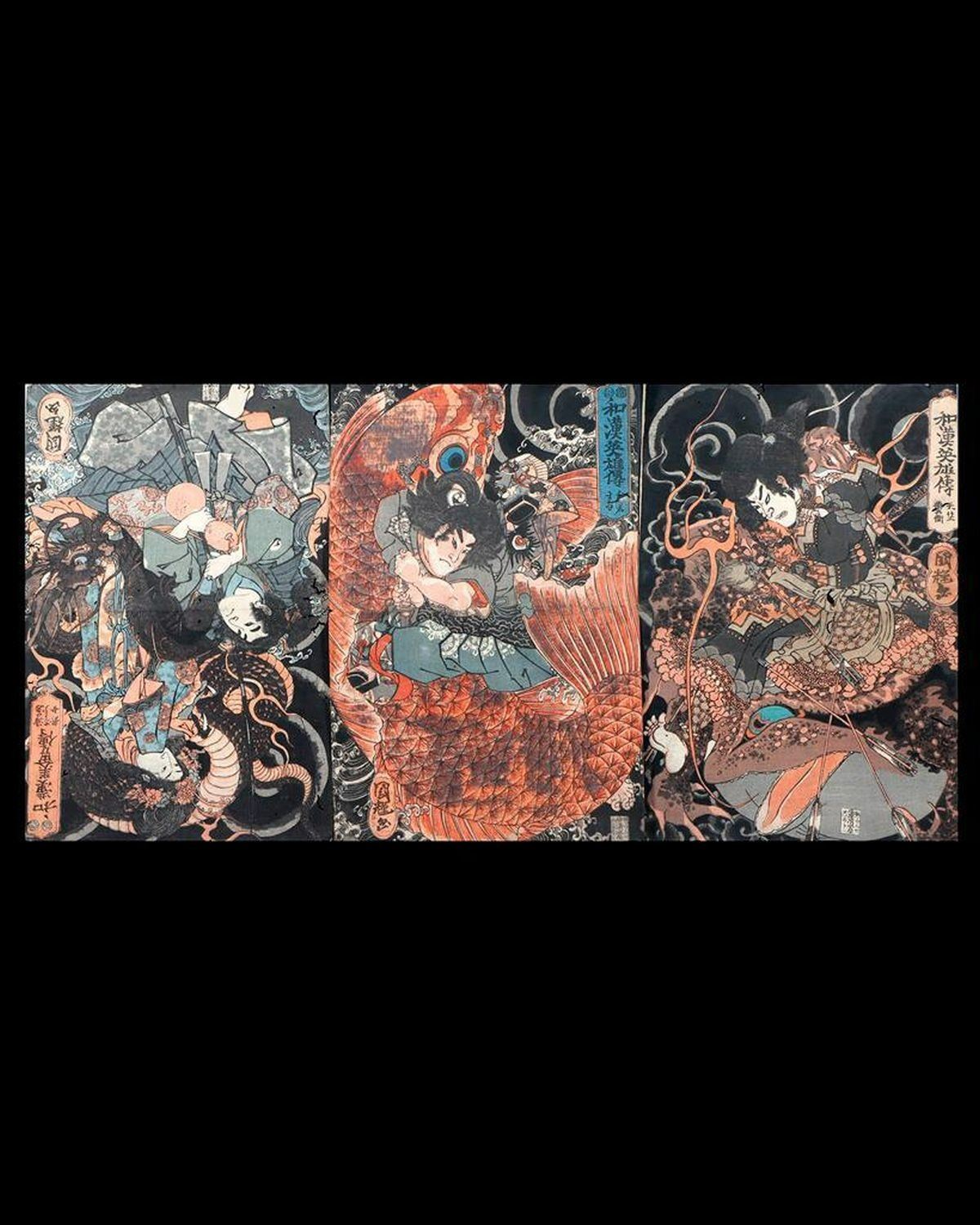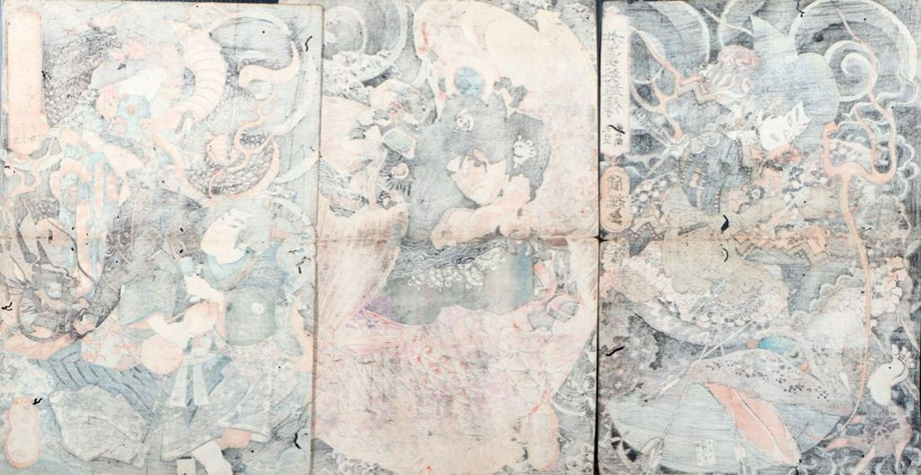 Artist :Kuniteru UTAGAWA (1808-1876) Series : Giants, Monsters, and Dragons(three works). Date :(ca. 1850s) Medium: Woodblock (three works) Dimensions :14 x 9 1/2 in. Condition :Backed, faded, trimmed, wormholes, small repairs, and dirty.