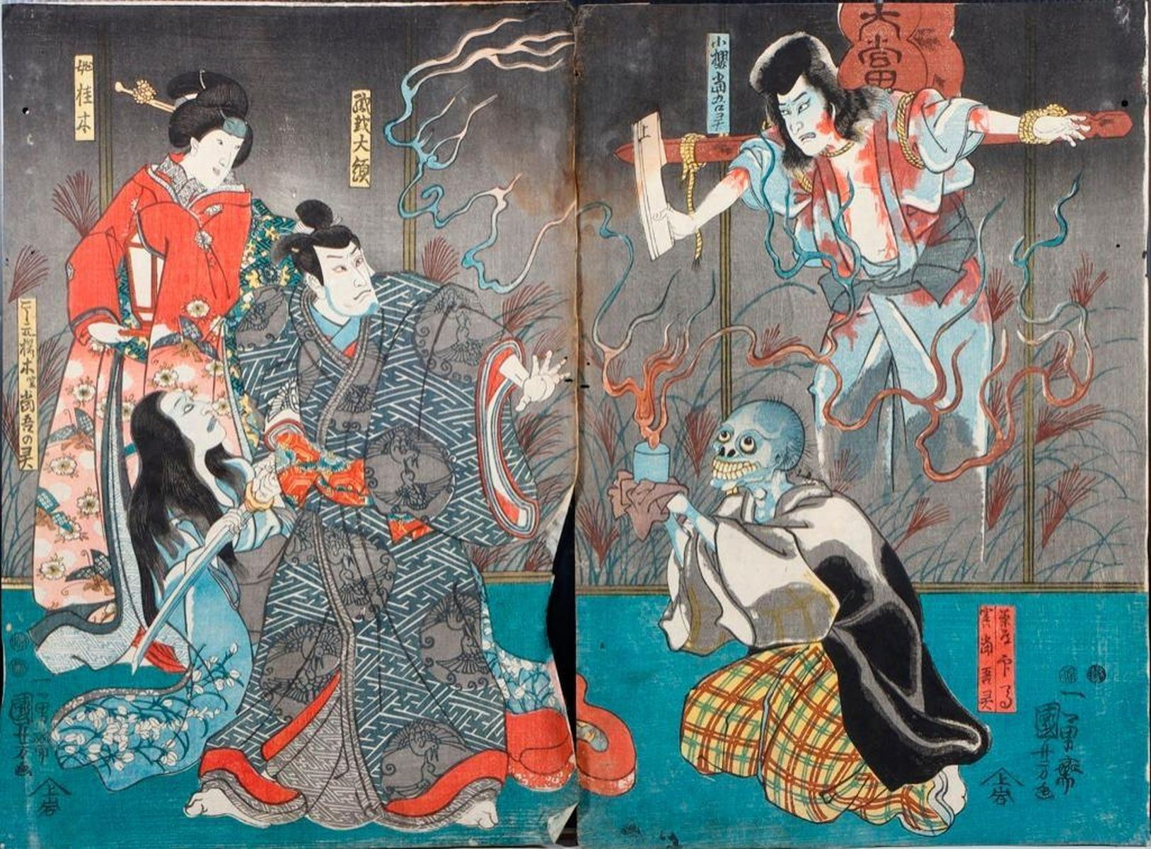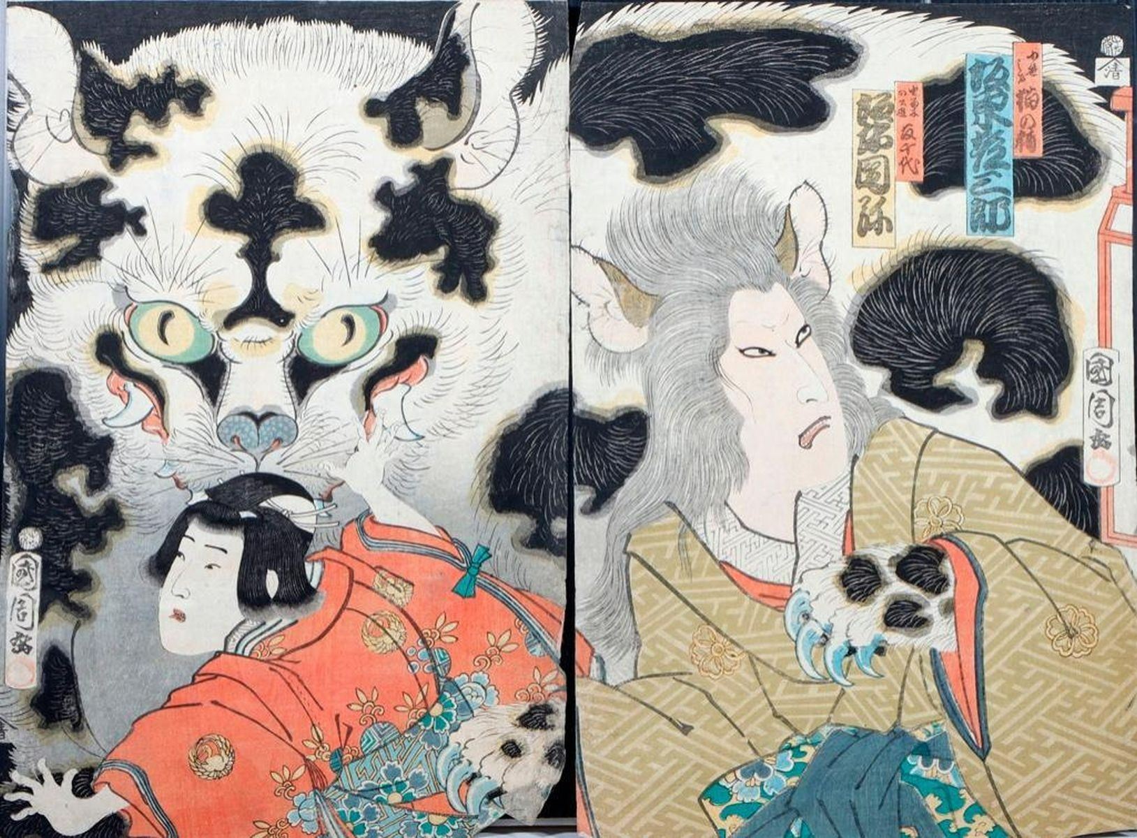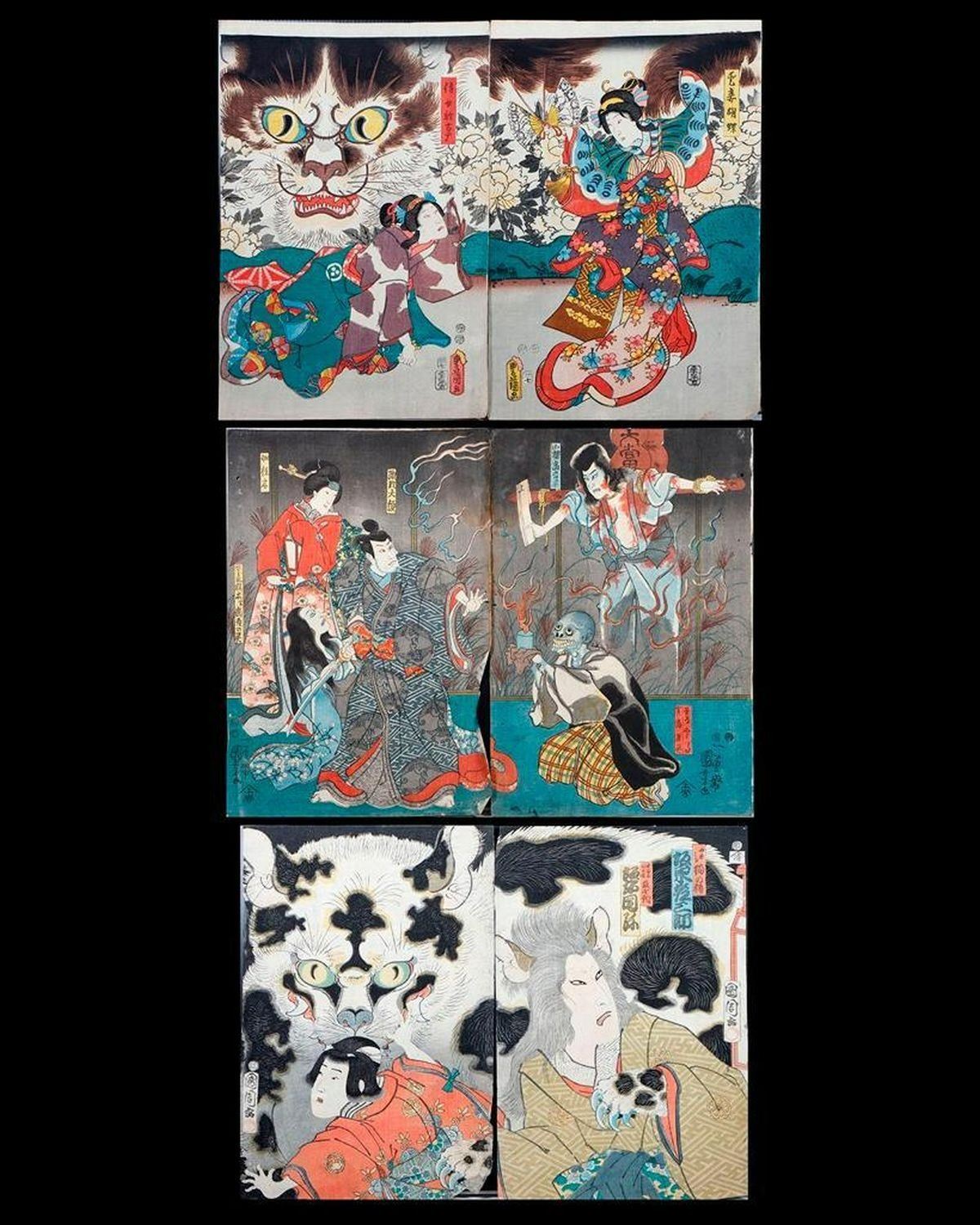 Artist :Kuniyoshi UTAGAWA (1797/98-1861),Kunisada UTAGAWA, Toyokuni III (1786-1865),Toyohara KUNICHIKA (1835-1900) Series : Ghost, Cat Witch, and Demons. Date : (ca. 1850s - 1860s) Medium: Woodblock (three diptychs) Dimensions : 14 x 10 in. Condition :Backed, faded, trimmed, loses, wormholes, and repairs.