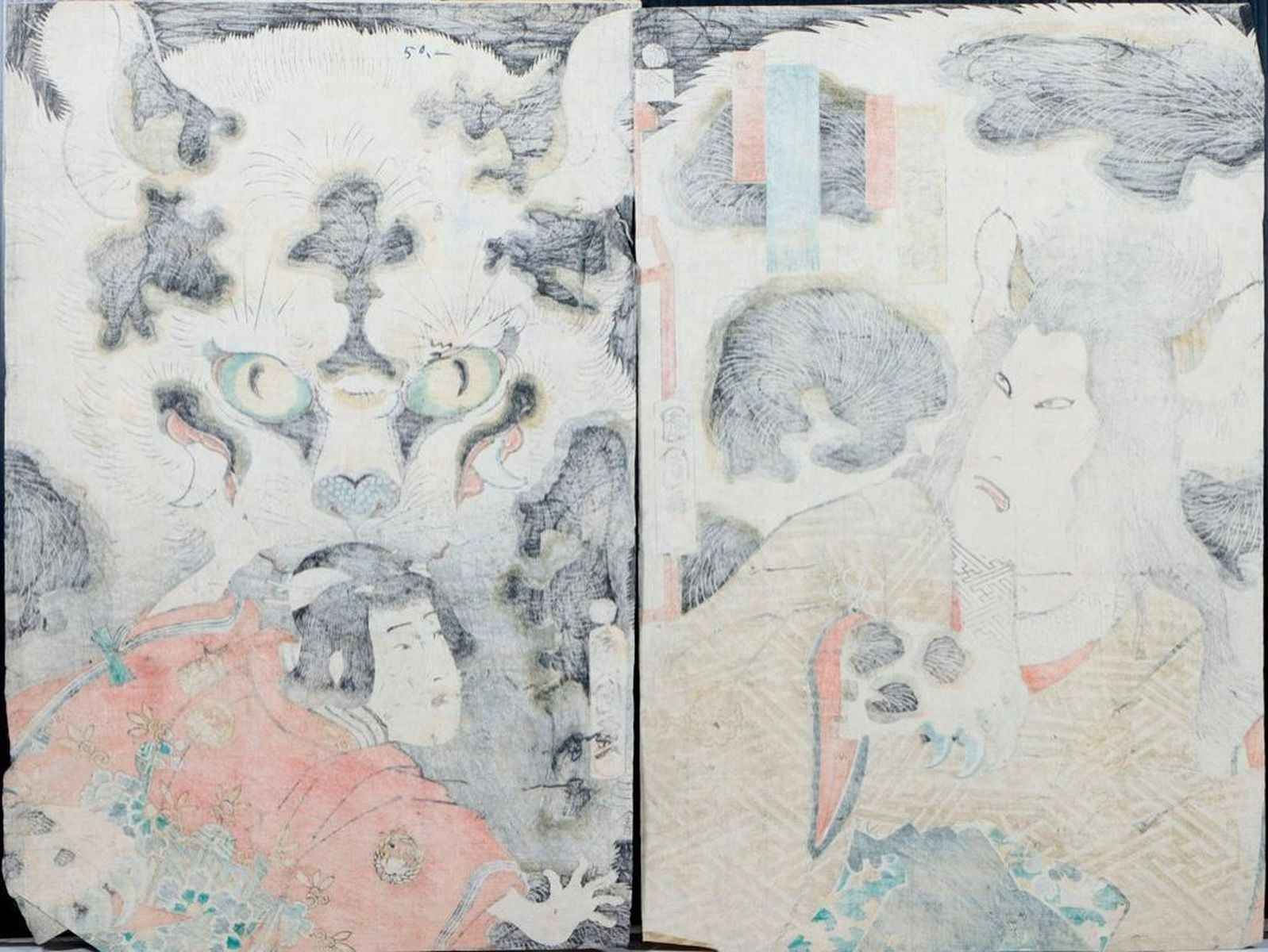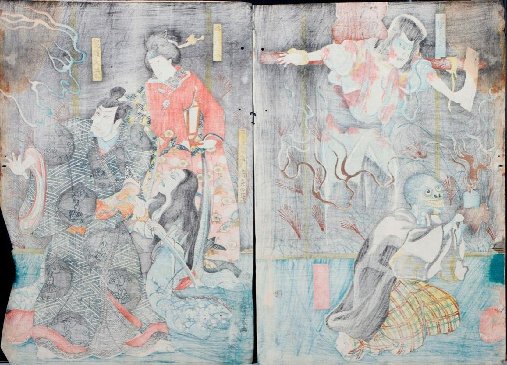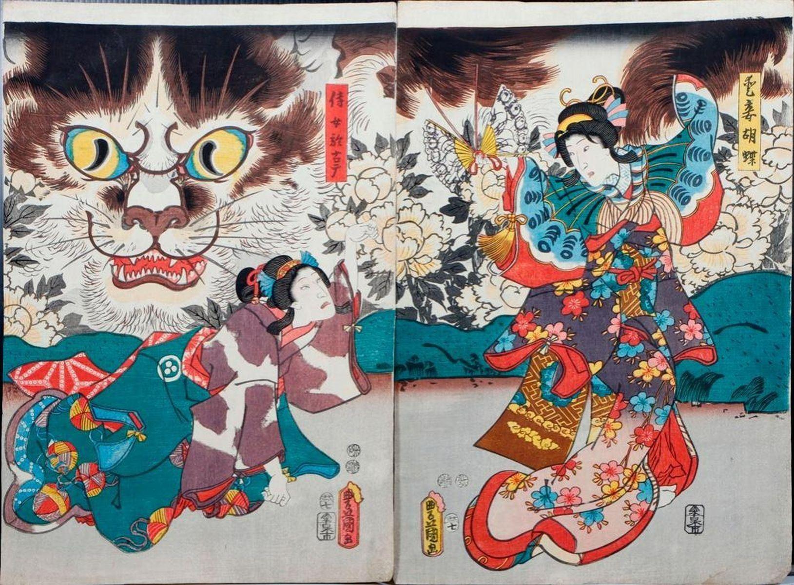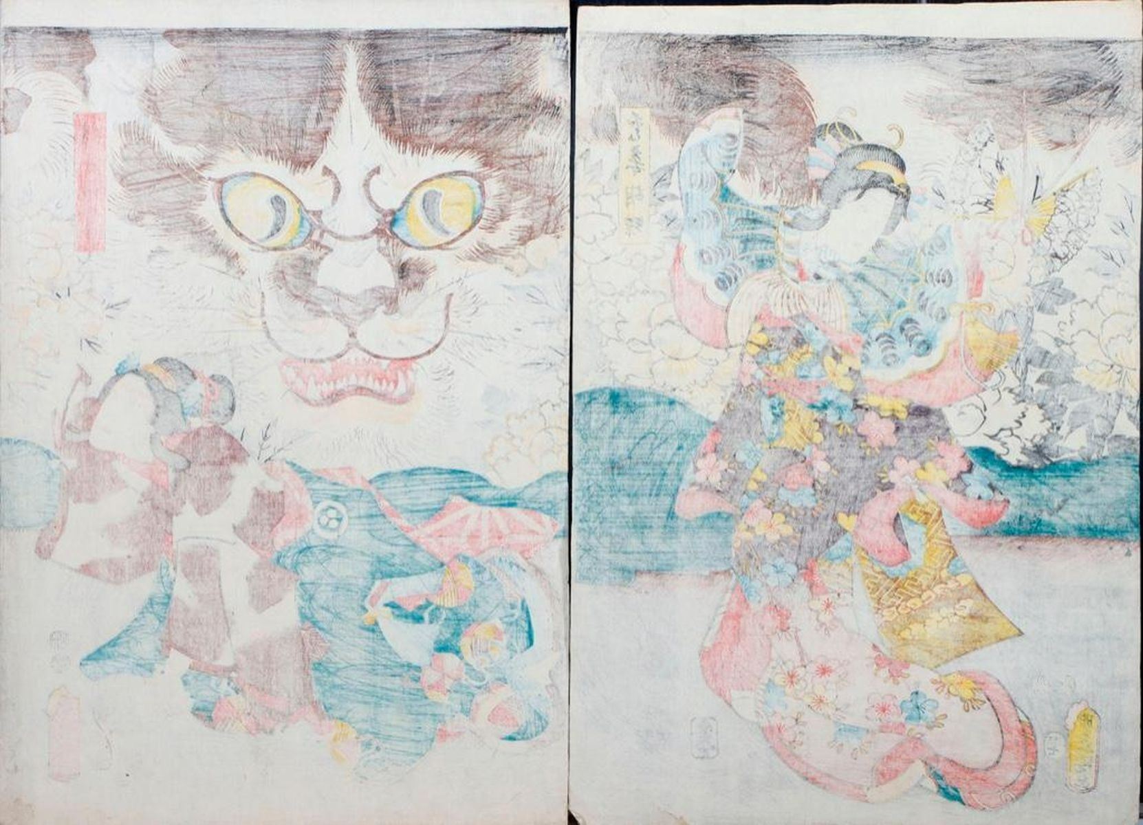 Artist :Kuniyoshi UTAGAWA (1797/98-1861),Kunisada UTAGAWA, Toyokuni III (1786-1865),Toyohara KUNICHIKA (1835-1900) Series : Ghost, Cat Witch, and Demons. Date : (ca. 1850s - 1860s) Medium: Woodblock (three diptychs) Dimensions : 14 x 10 in. Condition :Backed, faded, trimmed, loses, wormholes, and repairs.