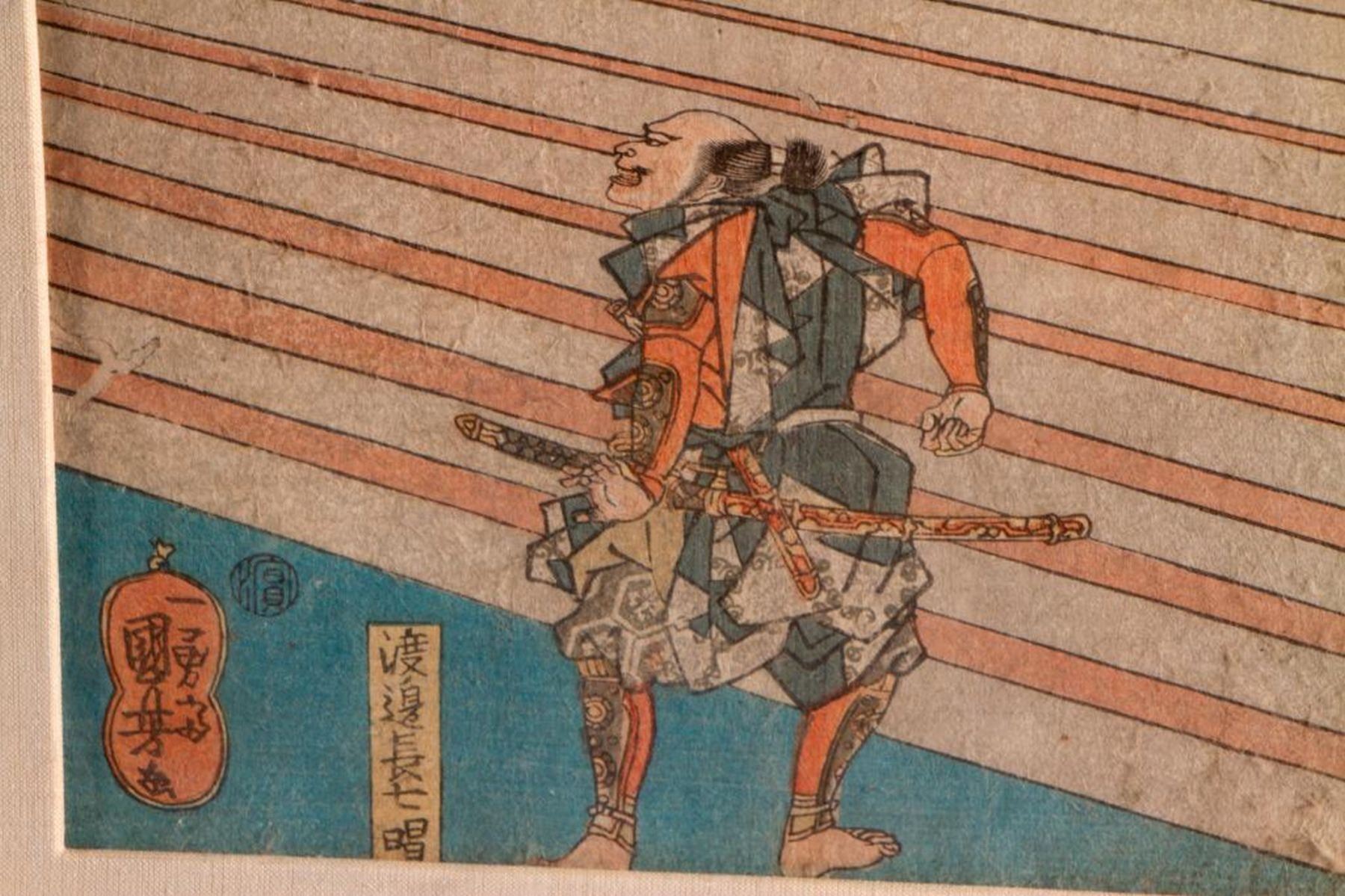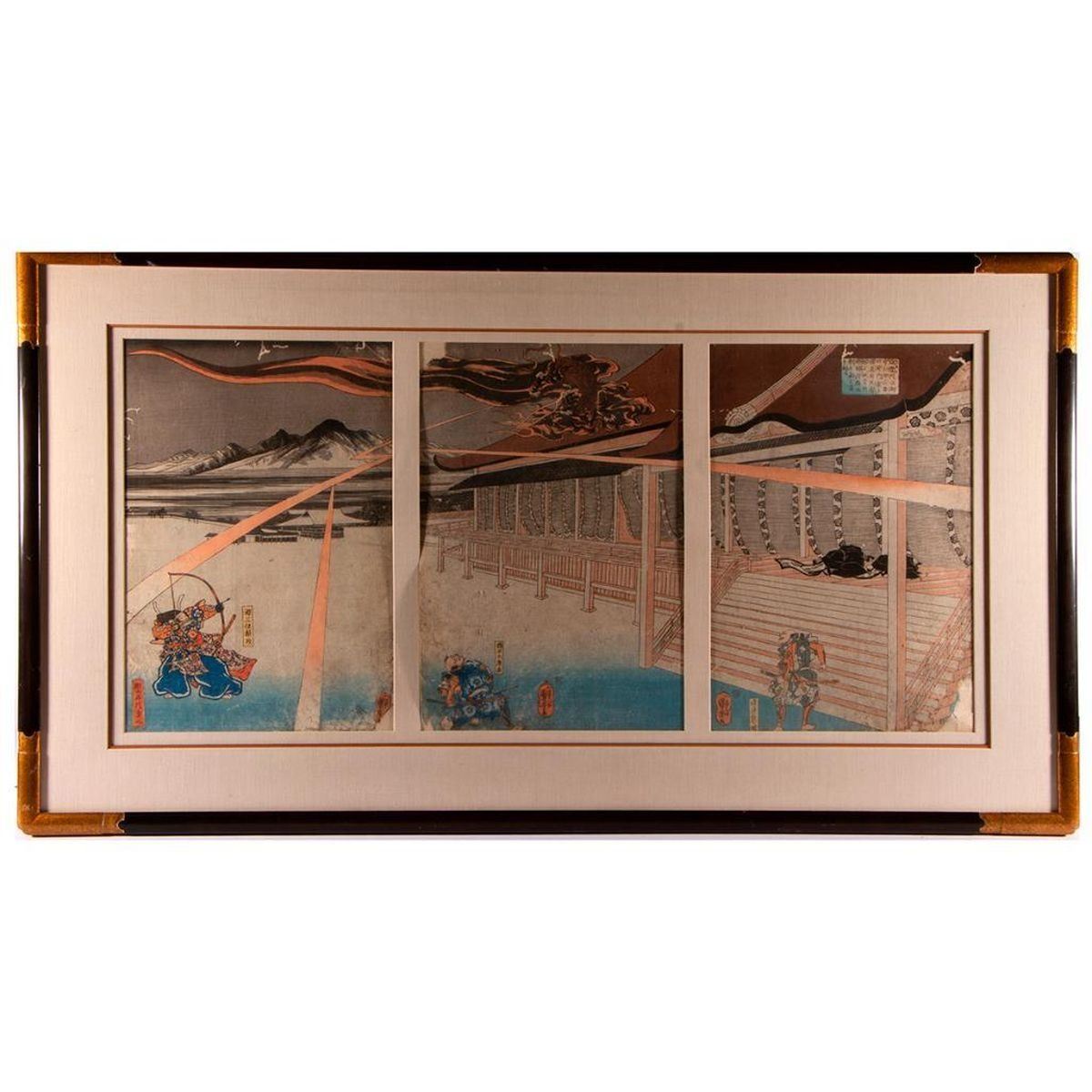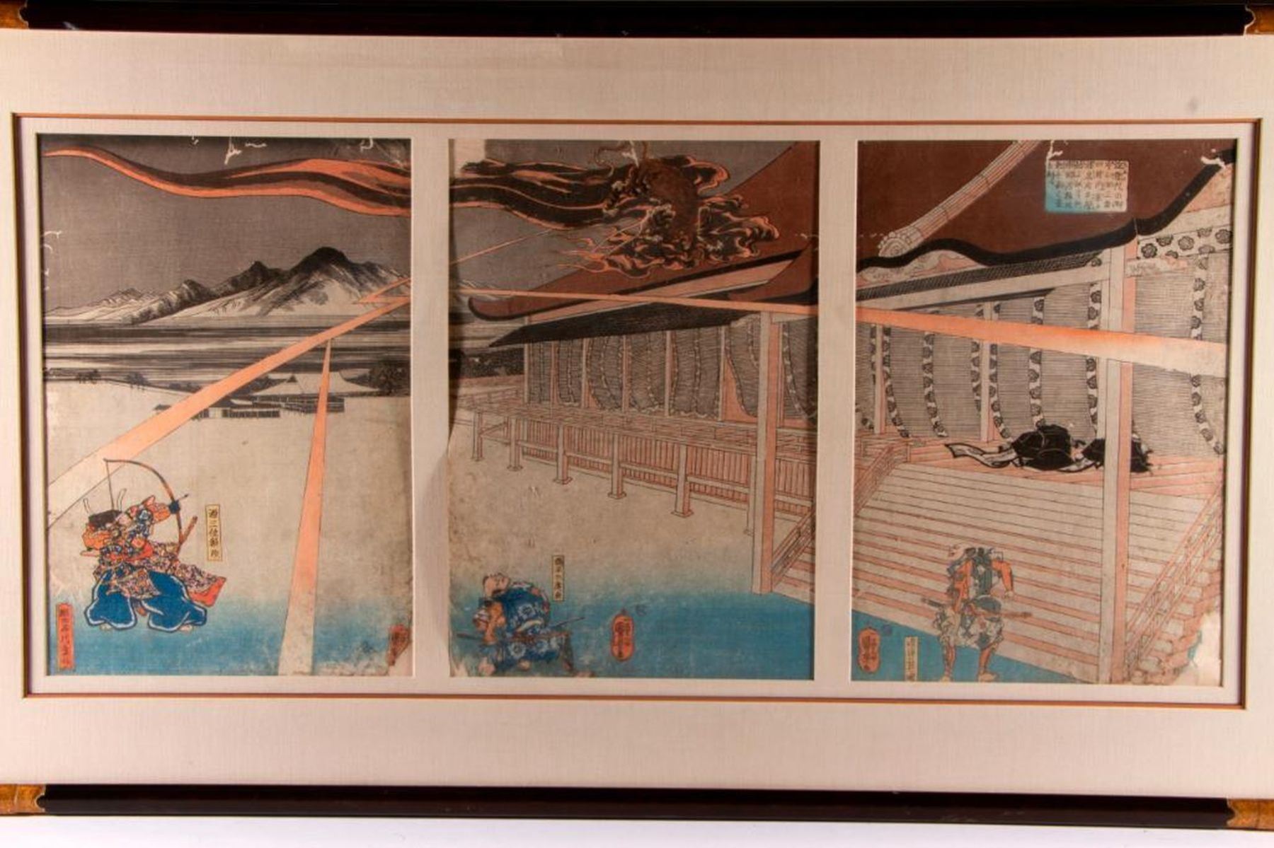 Artist: Kuniyoshi UTAGAWA (1797/98-1861). Medium: Print-Multiple, Woodcut in colors. Size image: 14" x 9 1/2" each. Size frame: 21" x 38". Condition: Fair to good, loss to bottom right panel.