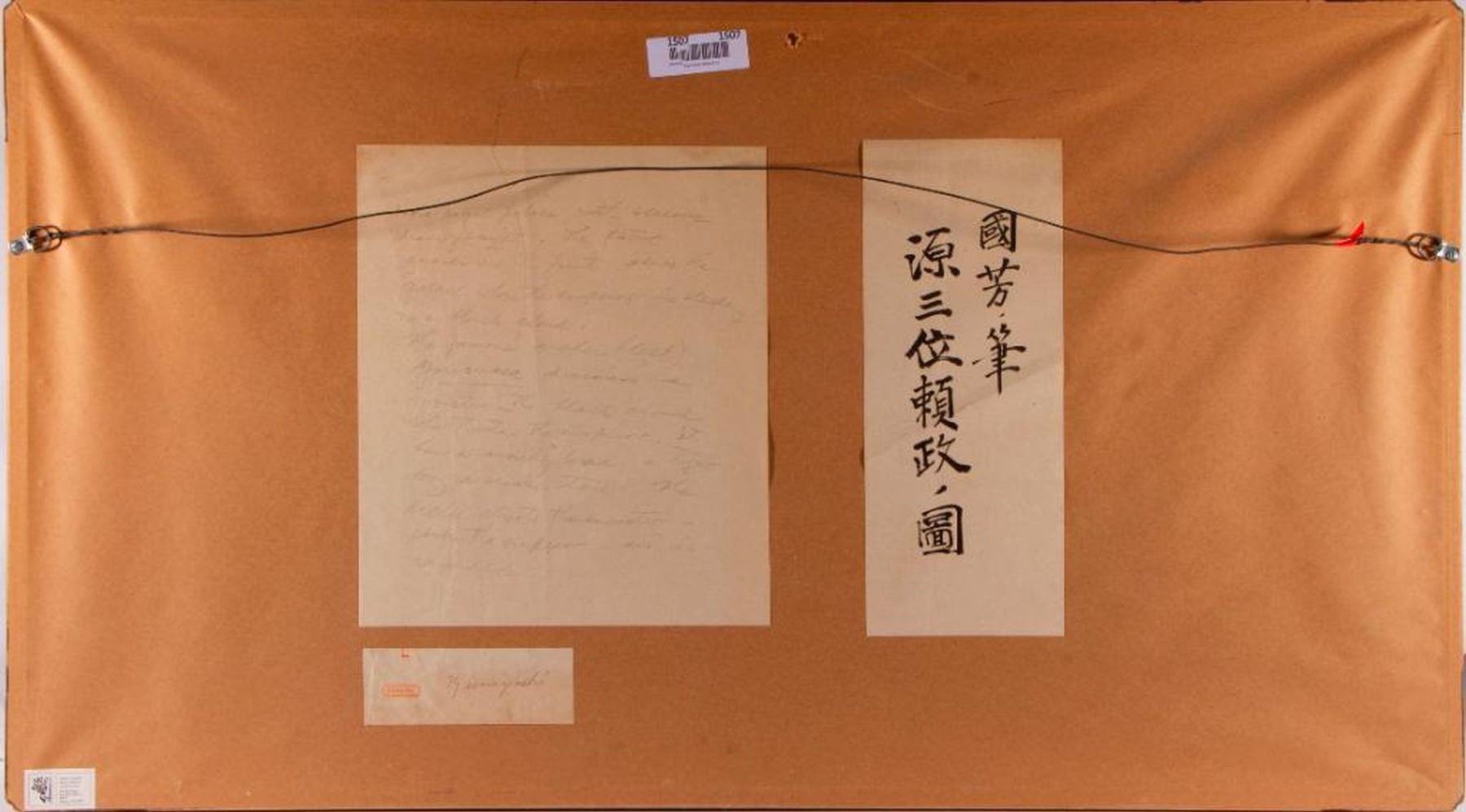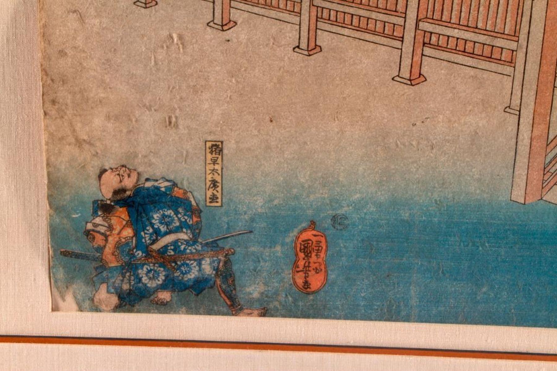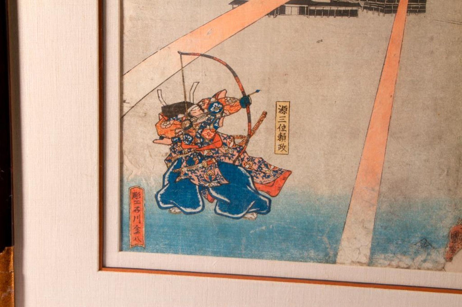 Artist: Kuniyoshi UTAGAWA (1797/98-1861). Medium: Print-Multiple, Woodcut in colors. Size image: 14" x 9 1/2" each. Size frame: 21" x 38". Condition: Fair to good, loss to bottom right panel.