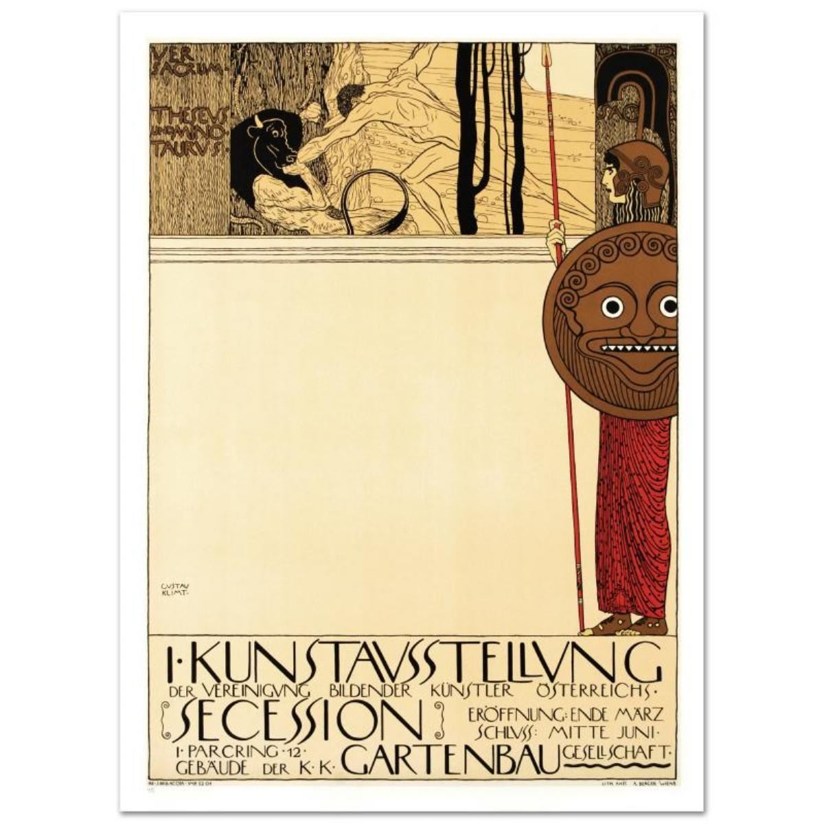 "Kunstavsstellvung" is a hand pulled lithograph on paper by the RE Society, image originally by Gustov Klimt. Measures approx. 22" x 30" (with border), 20" x 28" (image).