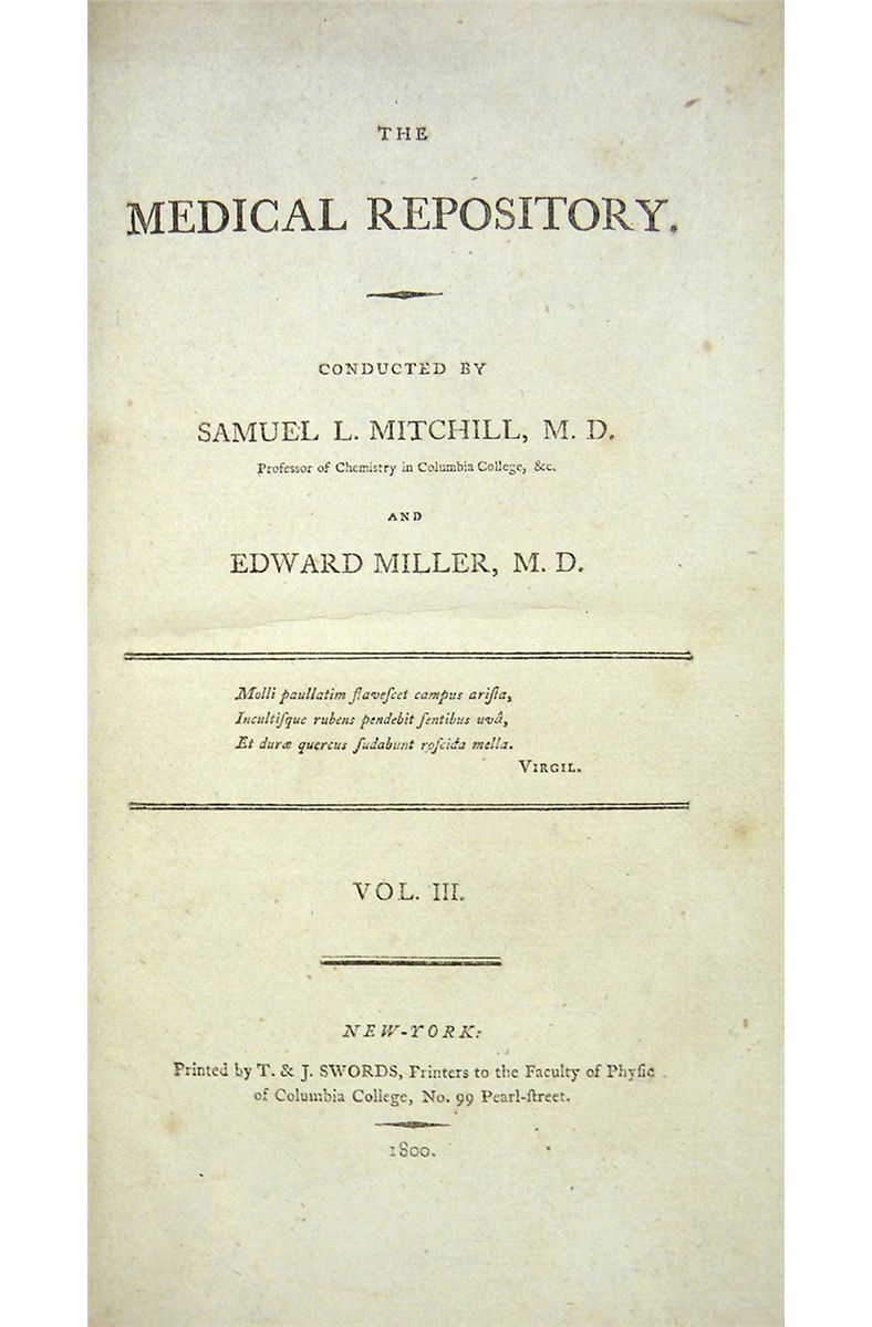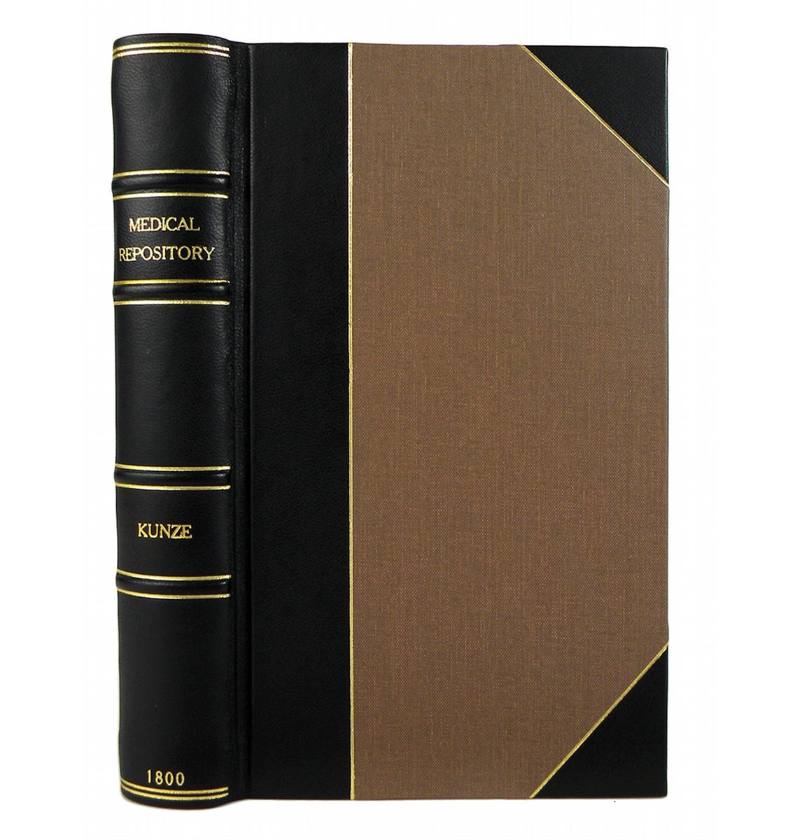Kunze, John C. DESCRIPTION OF A CABINET OF COINS AND MEDALS ANCIENT AND MODERN. The Medical Repository. Vol. III (1800). Conducted by Samuel L. Mitchill and Edward Miller. New York: Printed by T. & J. Swords. 8vo, recent black half leather with brown linen sides; spine with four raised bands, ruled and lettered in gilt. 7, (1), 428 pages [Kunze's article is on pages 351-359]. Ex C.N. Gallup library, with his bookplate. Extremities worn, but binding sound; some spotting. Near fine in a recent binding. John C. Kunze's 1800 description of his coin collection, possibly the only 18th-century account of a coin cabinet formed by an American collector. Kunze's little-known article, written in the form of a letter to Dr. Samuel Mitchill though intended for publication, is one of the very few detailed portrayals of coin collecting in the early days of the Republic. Kunze (1744-1807) was a Lutheran minister and professor. Having studied at the University of Leipzig, he moved to Philadelphia in 1770, married, and established the Lutheran Theological Seminary. The pastor of Zion Lutheran Church, he served as a member of the Board of trustees of the University of the State of Pennsylvania, where he also served as a professor of languages and philology. He later moved to New York, where he served the Trinity and Christ Church and taught Oriental languages at Columbia. [Online description truncated; see printed or PDF catalogue for full description.]