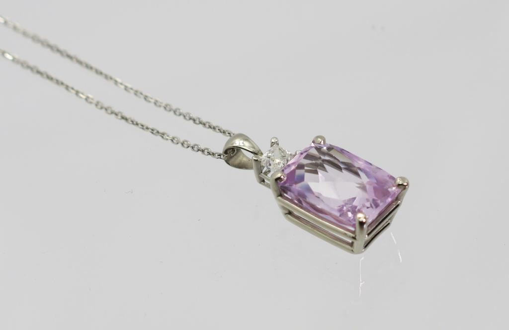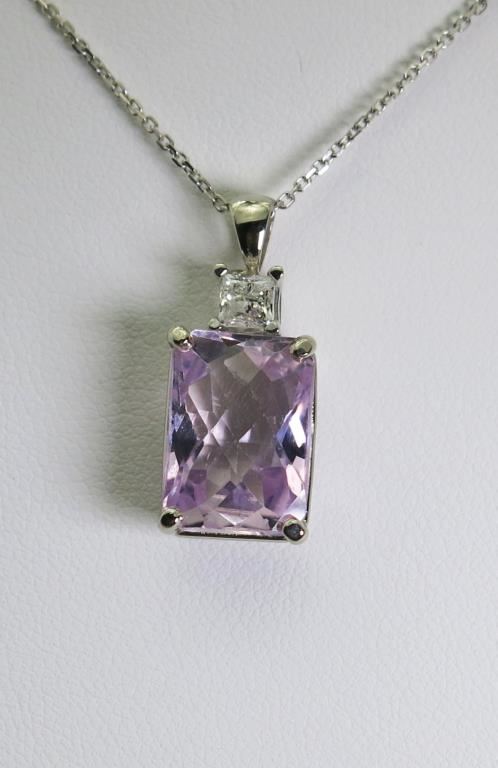 Cushion cut Kunzite weighing 7.30 carats with a princess cut diamond weighing 0.32 carats with G-H colors and SI clarity set in 14 karat white gold setting.