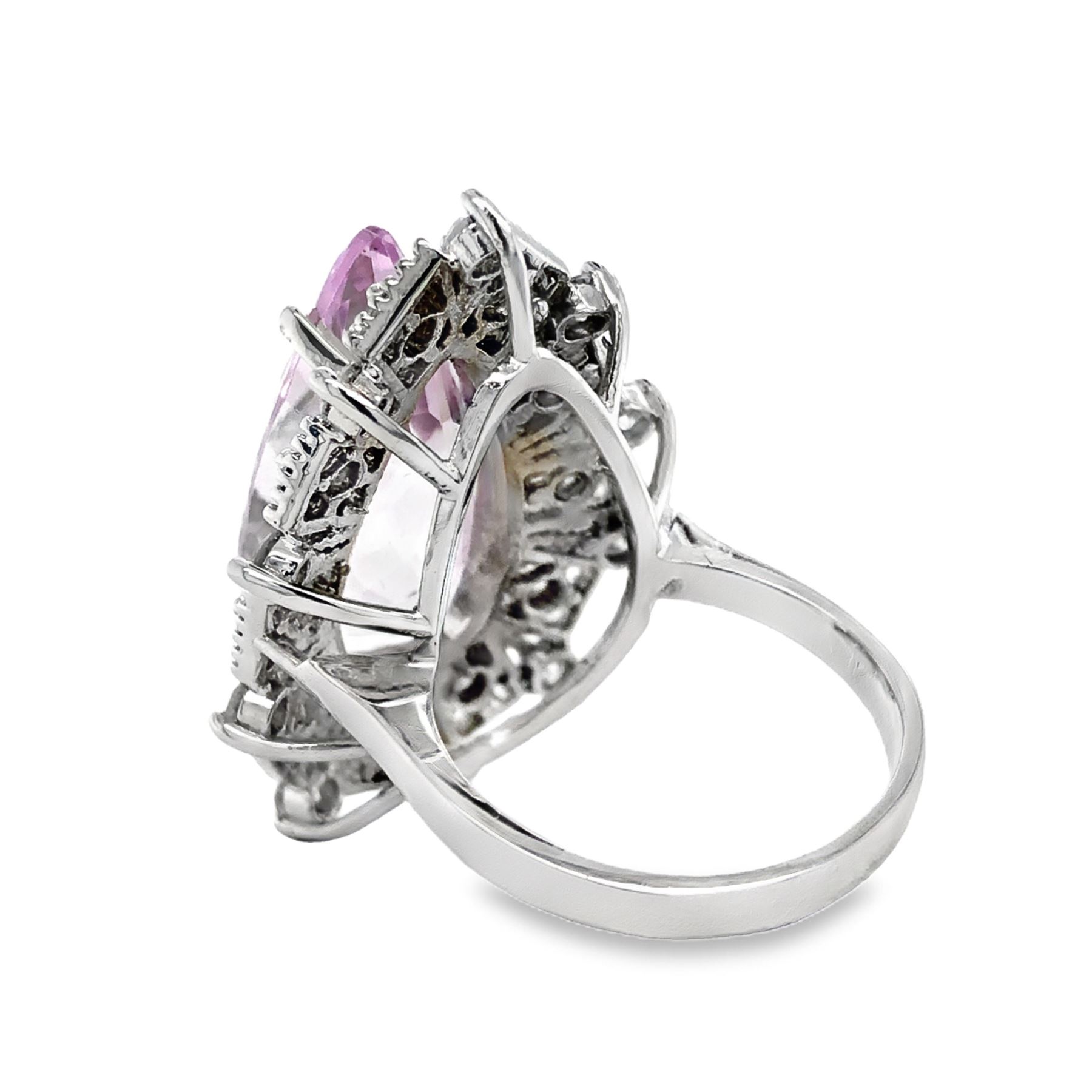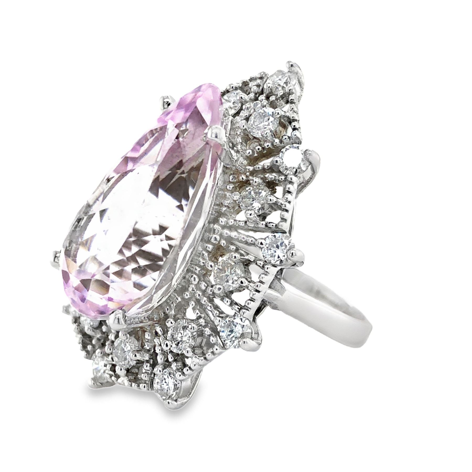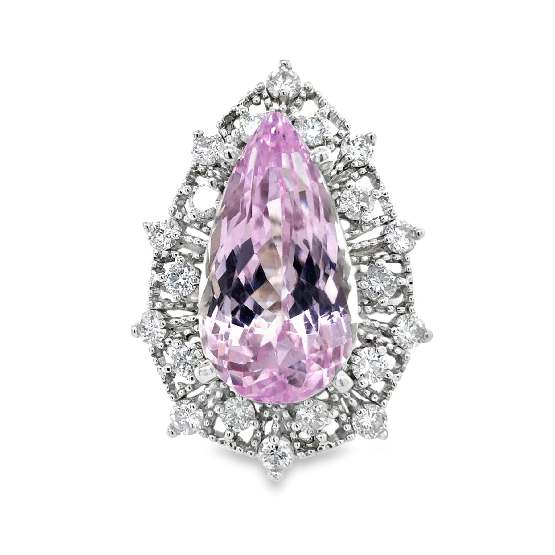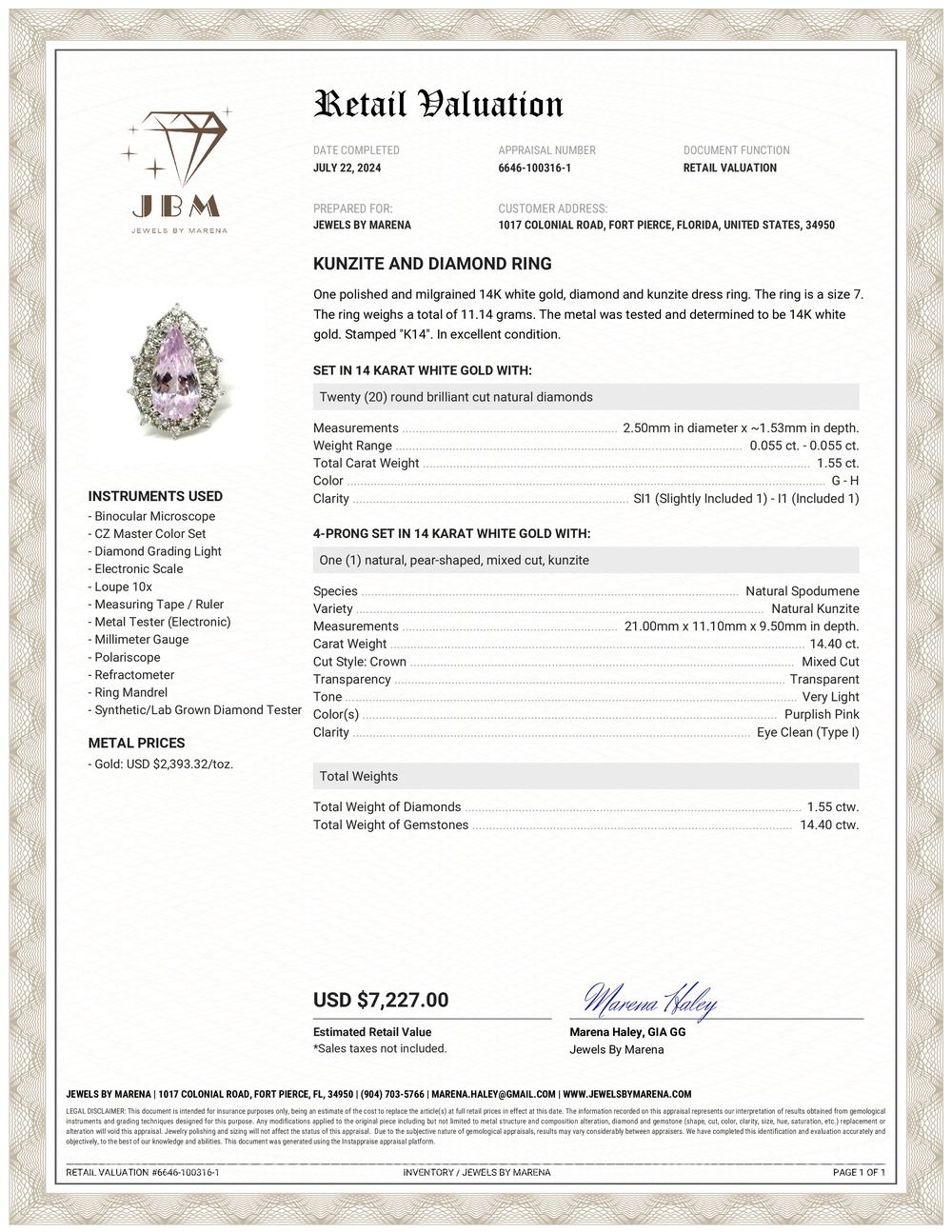 AF4796-16 / MYSS TITLE DESCRIPTION: Kunzite & Diamond Ring DESCRIPTION DETAIL: A gorgeous ring set centrally with a pear shaped Kunzite surrounded by a starburst halo of round brilliant cut natural Diamonds in 14K White Gold. OVERALL CONDITION: Excellent, New MAIN STONE: Natural Kunzite Shape: Pear Mixed Cut Approximate Weight: 14.40 Carats Color: Purplish-Pink Clarity: Eye Clean DIAMONDS: Natural (20) Shape: Round Brilliant Cut Approximate Weight: 1.55 Carats Total Weight Color: G-H Clarity: SI1-I1 METAL: 14K White Gold WEIGHT: 11.14 Grams SIZE: 7.00 US APPRAISAL REPORT: JBM certified and appraised this ring with an estimated retail replacement value of $7,227.00. THIS ITEM IS FROM AN ORDERED LIQUIDATION OF A MAJOR JEWELRY MANUFACTURER'S OVERSTOCKED INVENTORY. Please inquire about sizing if needed, and allow an additional 10 days for shipping if we resize it. PRIOR TO BIDDING READ THE DESCRIPTION, TERMS, AND CONDITIONS CAREFULLY This description and condition report is provided for your convenience based on the information provided by the consignor. CAA is not responsible for any discrepancies between this information and other opinions. Buyers Premium: 18% Payment Due in 5 days AF4796-16 / MYSS