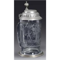 Csehország, 18. sz., színtelen hutaüveg, köszörult díszítéssel, ón szerelékkel és fedovel, m: 22 cm