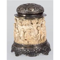 Nürnberg, 17. sz. vége, elefántcsont kupa ezüst montírozással, a négy évszak allegóriáival, fém és mesterjegy csak a fenéklemezen, fedél 19. századi pótlás, br. 486,6 g, m:15,5 cm