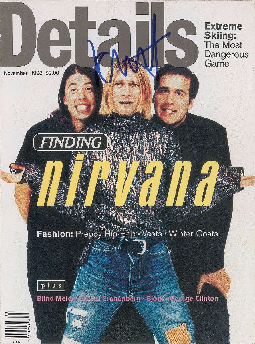 Details magazine cover from November of 1993, showing Nirvana’s drummer and bassist, Dave Grohl and Krist Novoselic, posing beside a quizzical Kurt Cobain, 8.25 x 10.75, signed above Cobain’s head in blue felt tip, “Kurt.” In fine condition. Following the breakthrough success of their second full-length album Nevermind, Nirvana released the highly anticipated In Utero in late September of 1993; the record quickly made its way to the top of the Billboard charts and has since sold 15 million albums worldwide. Cobain signed this magazine on November 19, 2003, the day after the trio famously recorded their MTV Unplugged album, opting to play a host of covers and band favorites as opposed to their more recognizable hits. Cobain’s autograph was obtained at JFK Airport, as the band headed back to Seattle, interestingly the rest of the band was present but refused to sign. Enhanced by the vibrancy of the magazine layout, this is a rare and highly desirable keepsake from grunge rock’s most identifiable artist. Originally obtained by in-person specialist Mike Wehrmann and accompanied by a letter of provenance by him.
