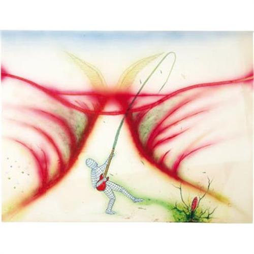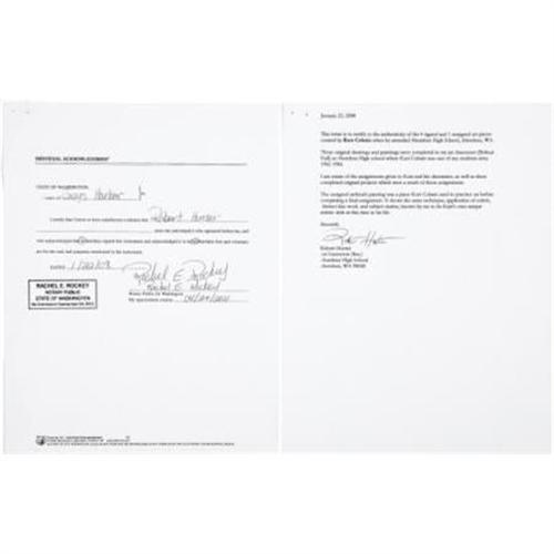<B>Kurt Cobain Unsigned Practice Drawing.</B></I> This is an unsigned 22" x 17" airbrush illustration of a guitarist playing in the middle of an abstract landscape, painted by the late Nirvana frontman while a student at Aberdeen High School, circa 1982-84. The piece was painted as a practice sketch before completing a final assignment. A rare sample of Cobain's artwork, it is in Excellent condition. Accompanied by a notarized letter of authenticity from Cobain's high school art teacher.<BR><BR><b>Shipping:</b> Flat Material, Large (<a target="_blank" href="http://www.heritageauctions.com/common/shipping.php">view shipping information</a>)