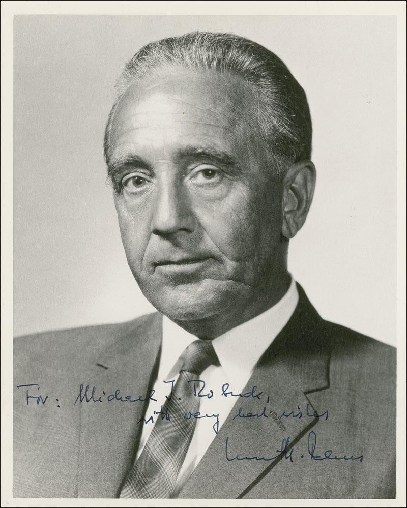 Former Germany V-2 rocket scientist (1908–1983) who in 1962 became the first director of the Kennedy Space Center. Matte-finish 8 x 10 photo, signed and inscribed in blue ink “For: Michael J. Robuck, with very best wishes, Kurt H. Debus.” In fine condition.