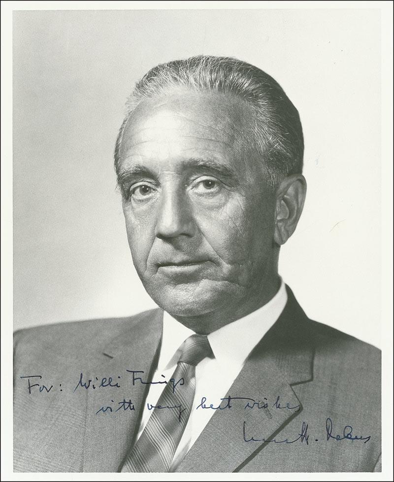 Former Germany V-2 rocket scientist (1908–1983) who in 1962 became the first director of the Kennedy Space Center. Matte-finish 8 x 10 portrait, signed and inscribed in fountain pen “To Willie Frings, with very best wishes, Kurt H. Debus.” In fine condition.