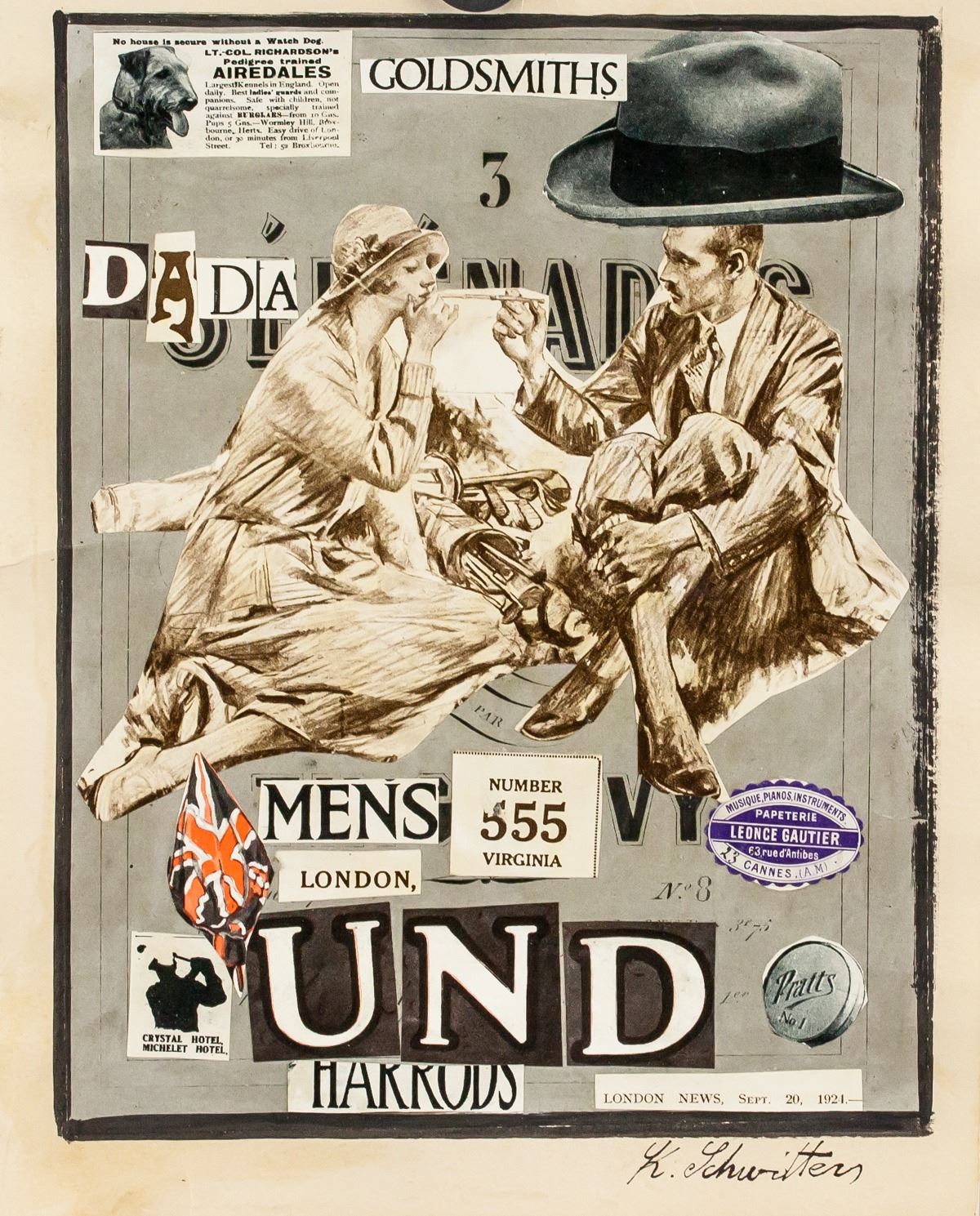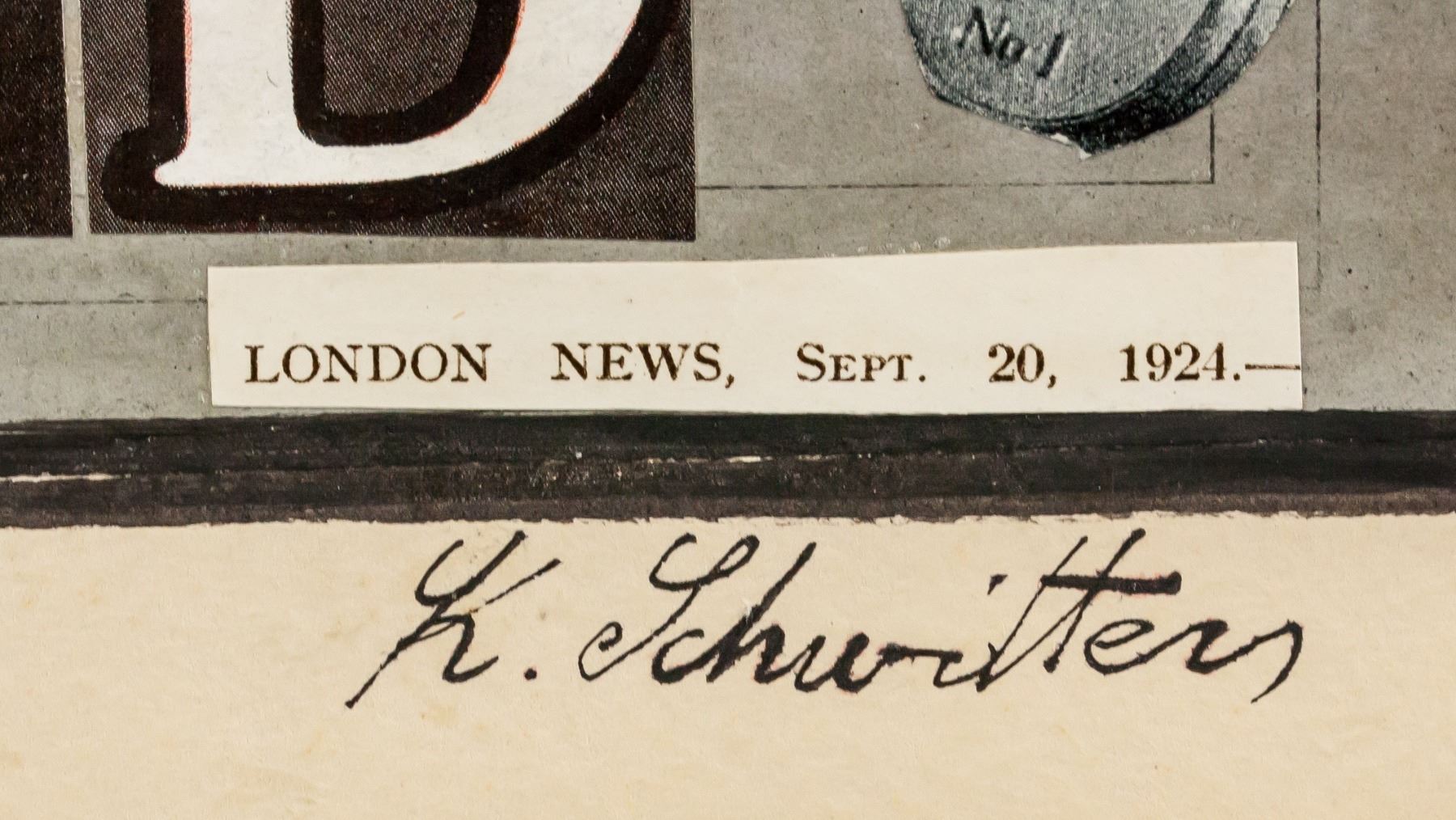 Mixed media on collage paper. Featuring a pastiche collage of various items. Signed K. Schwitters on the lower right corner. Attributed to Kurt Schwitters (1887-1948, German). 29 x 23 cm (17.5 x 9 inches). Provenance: This lot carries limited provenance from an Upper New York estate