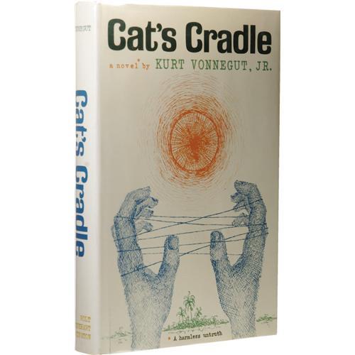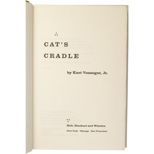 <B>Kurt Vonnegut, Jr.: <I>Cat's Cradle</B></I>.</B></I> (New York: Holt, Rinehart and Winston, 1963), first edition, 233 pages, three-quarter lime green cloth and baby blue boards with blue and gilt lettering on the spine and front board, 8vo (5.75" x 8.5"), dust jacket (in protective Mylar). In 1963, Graham Greene called <I>Cat's Cradle</B></I> "one of the three best novels of the year by one of the most able living writers." Interestingly, this novel earned Vonnegut a Master's degree in Anthropology from the University of Chicago upon its release, a degree he was not able to earn while a student there just after returning from World War II. The copy presented here is in fine condition, with very minimal wear to the edges of the book and jacket. A real find for the Vonnegut enthusiast. <I>From the Ventura Collection.</B></I><BR><BR><b>Shipping:</b> Books & Catalogs (<a target="_blank" href="http://www.heritageauctions.com/common/shipping.php">view shipping information</a>)