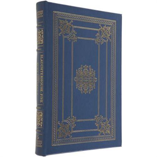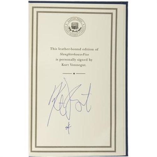 <B>Kurt Vonnegut, Jr. </B></I><B><I>Slaughter House-Five or The Children's Crusade A Duty-Dance with Death</B></I></B></I><B>.</B></I> Norwalk: The Easton Press, 1998. <BR> <BR>Signed collector's edition. Signed by the author on a special limitation bound in front. Octavo. 205 pages.<BR><BR>Full leather binding with titles and decoration stamped in gilt on the spine and boards. All edges gilt. Four raised bands on the spine. Moire endpapers. Attached silk ribbon place marker. A beautiful copy of this classic work in fine condition.<BR><BR><BR><b>Shipping:</b> Books & Catalogs (<a target="_blank" href="http://www.heritageauctions.com/common/shipping.php">view shipping information</a>)