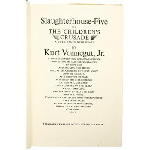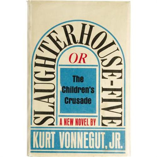 <B>Kurt Vonnegut, Jr.: <I>Slaughterhouse-Five</B></I></B></I>; <I>or The Children's Crusade: A Duty-Dance with Death</B></I> (New York: Delacorte Press, 1969), first printing, 186 pages, baby blue cloth with red, gilt, and black titles, 8vo (5.5" x 8.5"), dust jacket. Vonnegut's experience as a P.O.W. in Dresden during World War II was the major influence on this classic mind-bending mix of science fiction and postmodernism. The author witnessed the fire-bombing in Dresden in 1945, and it is a central plot element of <I>Slaughterhouse-Five.</B></I> <I>The New York Times</B></I> said of the book that "you'll either love it, or push it back in the science-fiction corner." Millions of readers have grown to love it. The book is in fine condition in a very good, slightly soiled unclipped dust jacket.<BR><BR><b>Shipping:</b> Books & Catalogs (<a target="_blank" href="http://www.heritageauctions.com/common/shipping.php">view shipping information</a>)