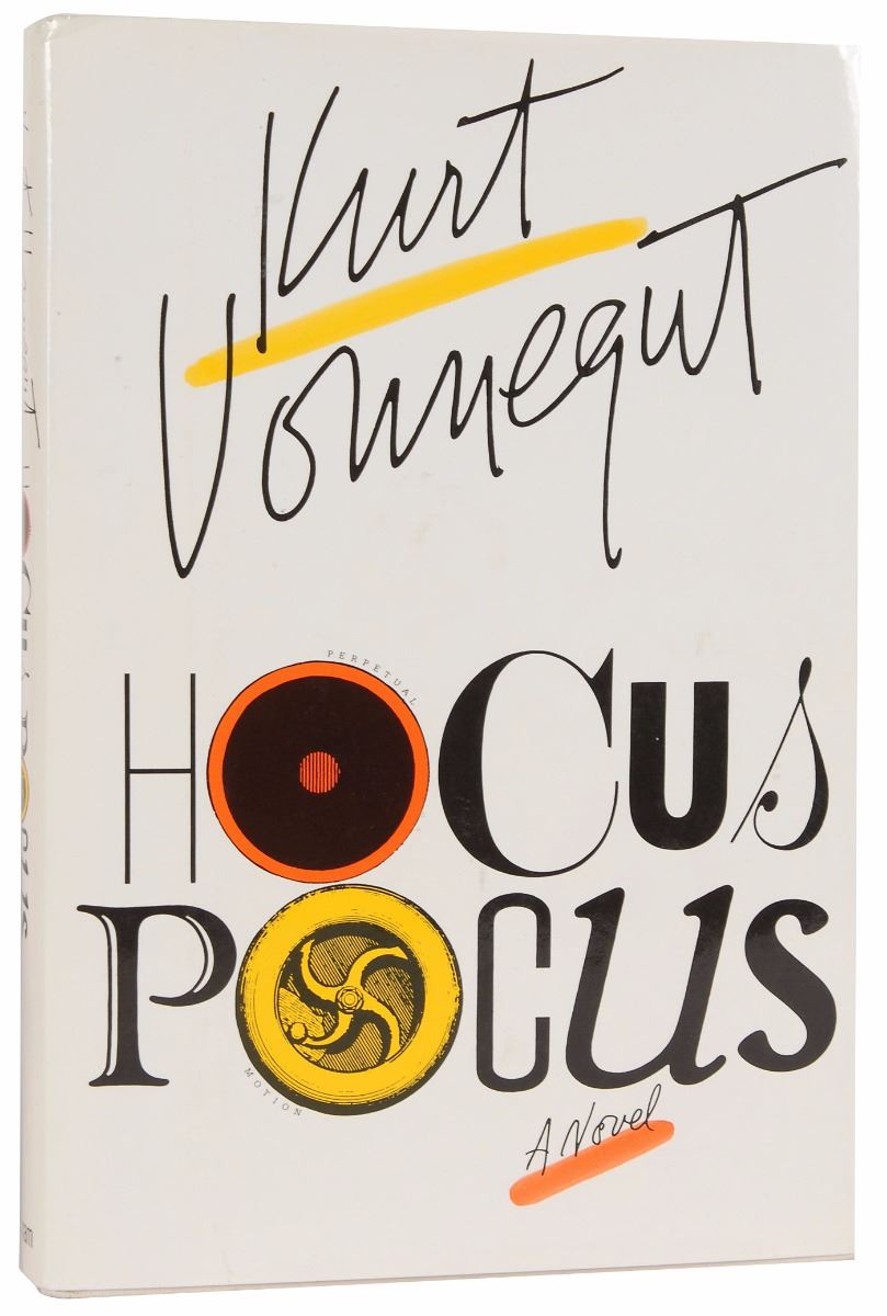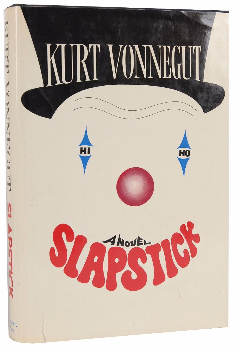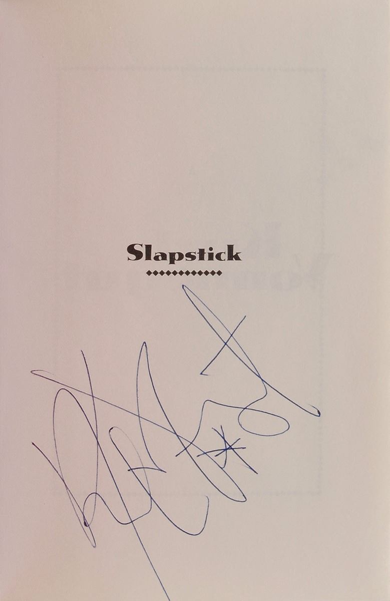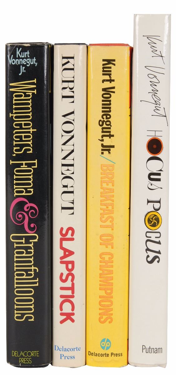 Three signed first edition books, titles include: Slapstick, hardcover with dust jacket, signed on the half-title page in blue ballpoint; Wampeters, Foma & Granfalloons, hardcover with dust jacket, signed on a free end page in blue ballpoint; and Hocus Pocus, hardcover with dust jacket, vertically signed on a free end page in black ink. Also includes a black felt tip signature, “Kurt Vonnegut,” on an orange 4.25 x 2.75 bookplate, and a first edition of Breakfast of Champions. In overall fine condition.
