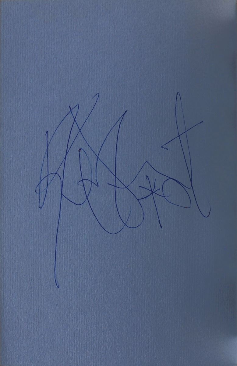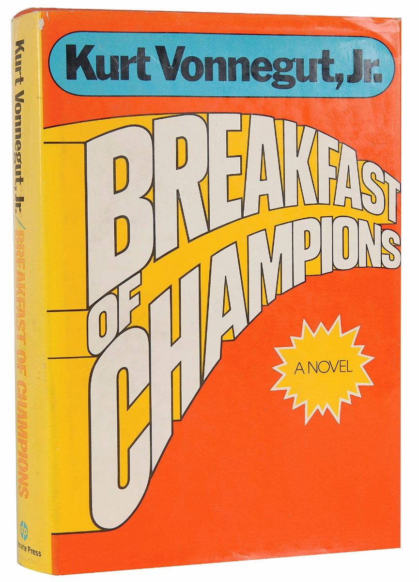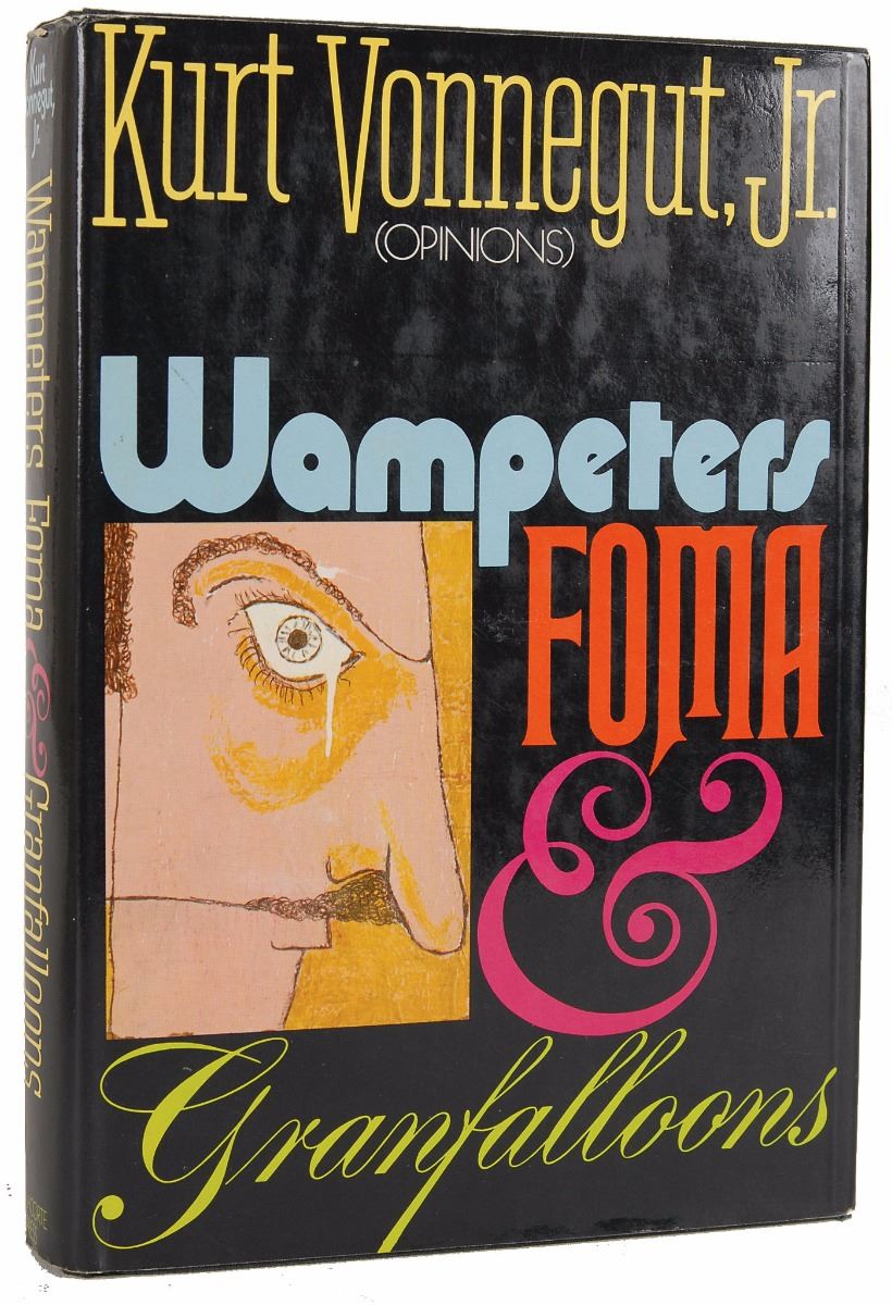Three signed first edition books, titles include: Slapstick, hardcover with dust jacket, signed on the half-title page in blue ballpoint; Wampeters, Foma & Granfalloons, hardcover with dust jacket, signed on a free end page in blue ballpoint; and Hocus Pocus, hardcover with dust jacket, vertically signed on a free end page in black ink. Also includes a black felt tip signature, “Kurt Vonnegut,” on an orange 4.25 x 2.75 bookplate, and a first edition of Breakfast of Champions. In overall fine condition.
