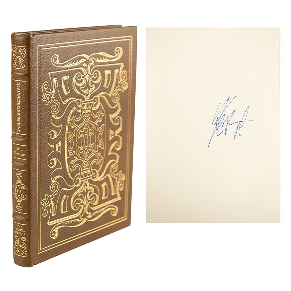 Signed book: Slaughterhouse Five. Limited edition. Franklin Center, PA: The Franklin Library, 1978. Leatherbound hardcover, 6.5 x 8.75, 173 pages. Signed on the first free end page in blue felt tip by Kurt Vonnegut. In very fine condition.