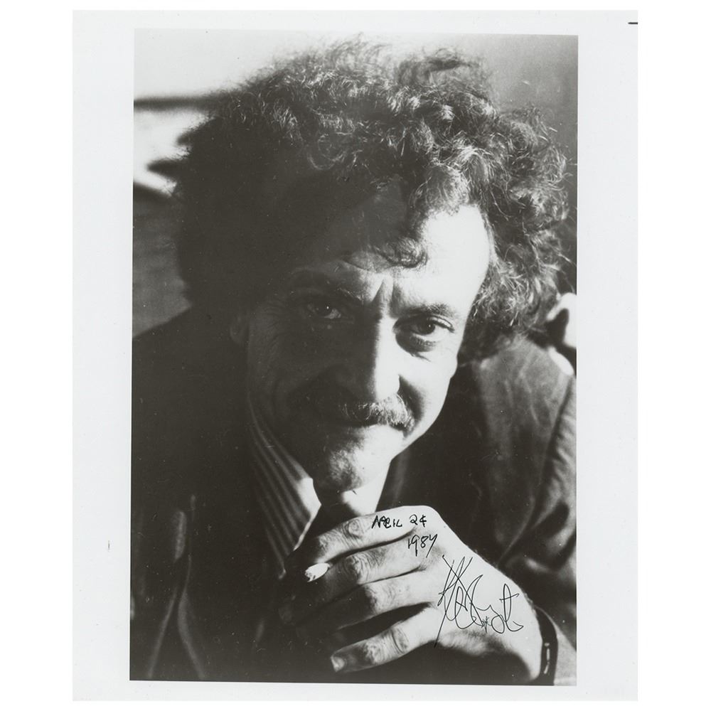 Glossy 8 x 10 photo of the popular Slaughterhouse-Five author, signed in black felt tip, "April 24, 1987, Kurt Vonnegut." In fine condition.