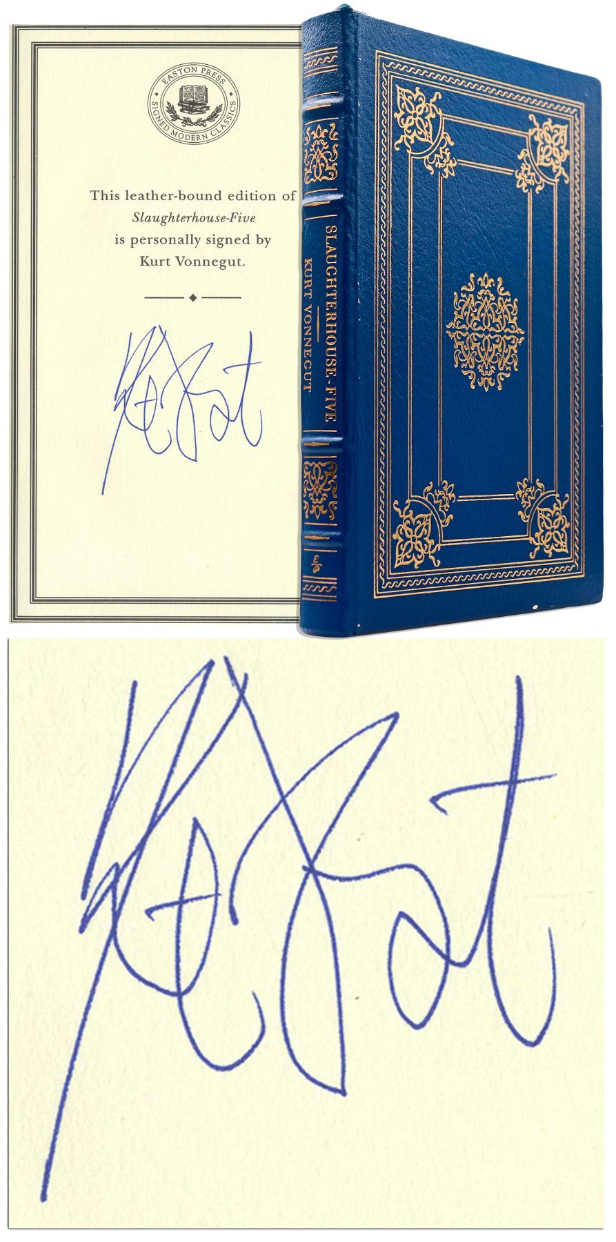 Kurt Vonnegut signed limited edition of ''Slaughterhouse-Five'', considered the greatest anti-war novel of 20th century literature. Norwalk, CT: Easton Press, 1994. Signed by Vonnegut upon the limitation page in blue fountain pen, deluxe leather-bound limited edition features ribbed spine, gilt lettering and all edges gilt, with watered silk endpapers and satin page marker. Measures 6'' x 8.75''. Minute nick to lower edge of front board, overall in near fine condition.