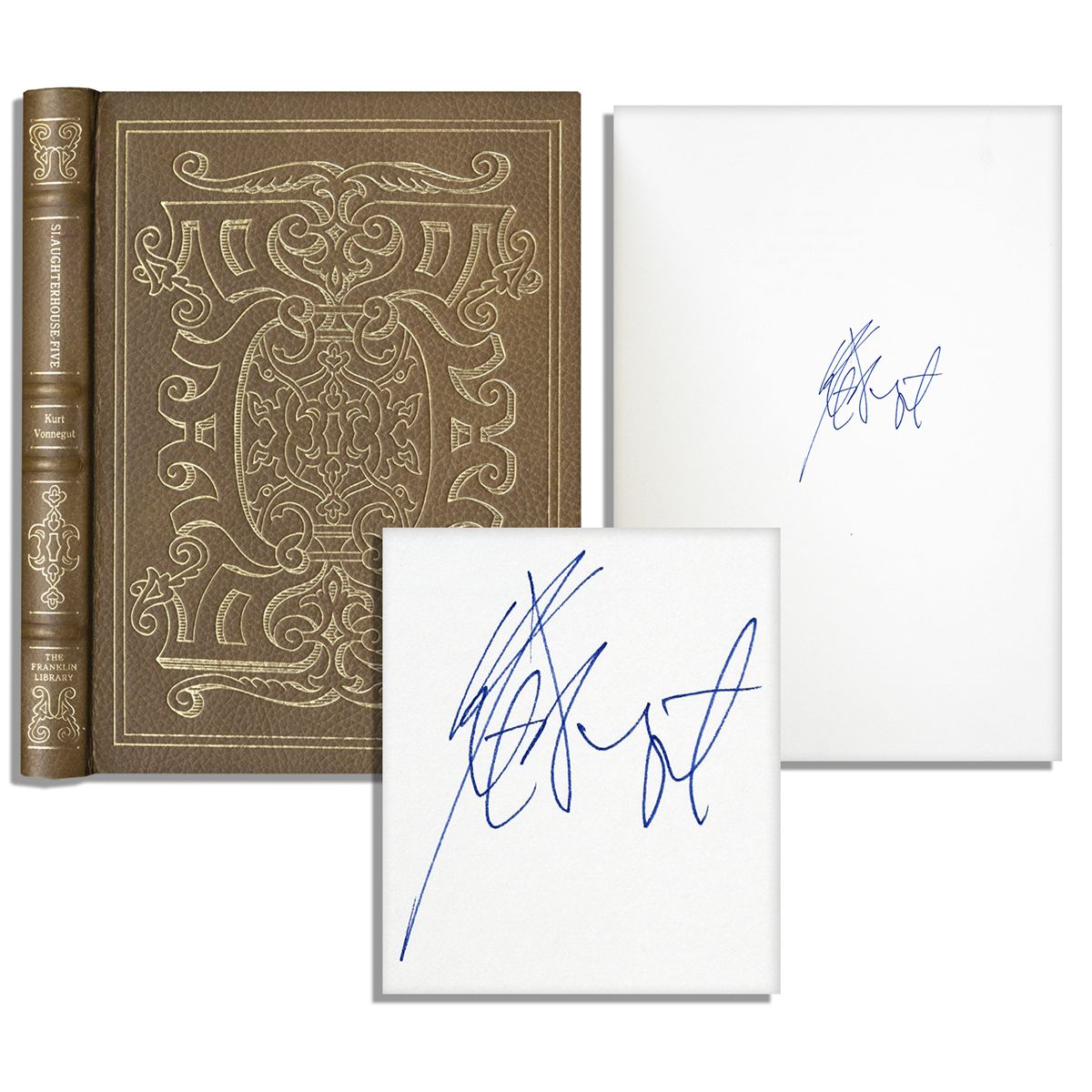 Kurt Vonnegut signed ''Slaughterhouse-Five'', published by the Franklin Library: Franklin Center, PA: 1978. Luxury limited edition is signed upon the fly-leaf ''Kurt Vonnegut'' in blue ink. Vonnegut's book, inspired by his experience as a survivor of the fire bombing of Dresden during WWII, runs 173pp. Bound in toffee colored leather boards with ribbed spine, gilt lettering and all edges gilt. Interior features peach silk moire endpapers and a satin page marker. Measures 6.5'' x 9''. Subtle fading to edges of endpapers. Near fine.