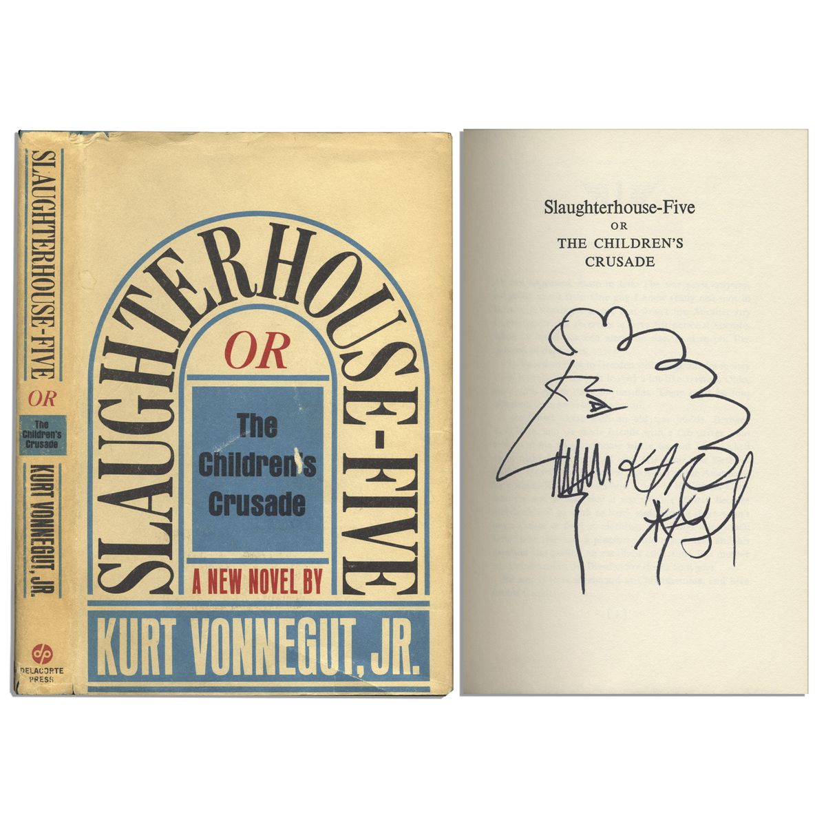 Kurt Vonnegut signed first edition of ''Slaughterhouse-Five'', from a later printing, published by Seymour Lawrence: Delacorte Press: 1969. Vonnegut adds his distinctive illustrated signature - a combination of signature and self-portrait sketch - to the half title page in black felt tip. Runs 186pp. Bound in turquoise cloth boards with silver and red metallic lettering. With original unclipped dustjacket in near fine condition save for light toning, a small tear to bottom edge and a small spot of surface loss on front panel. Measures 5.75'' x 8.5''. Book shows subtle fading to board edges and a small abrasion to tail edge. Near fine overall.