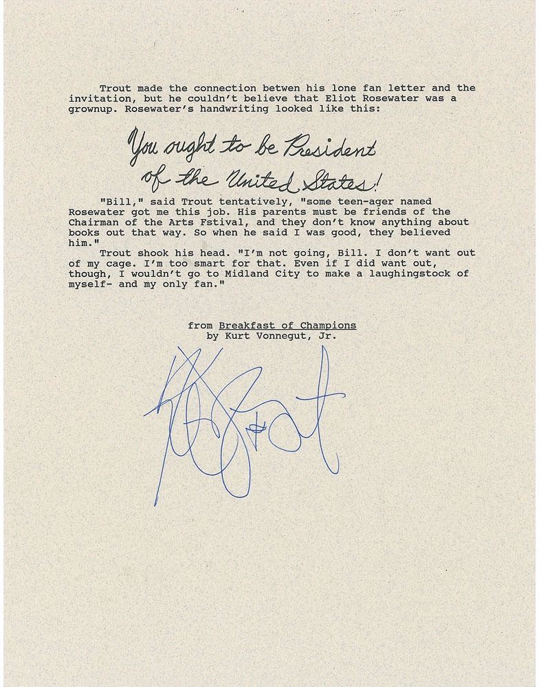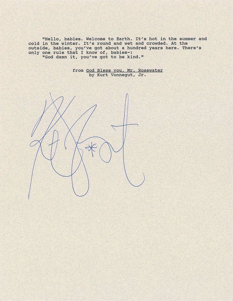 Two souvenir typescripts, each one page, 8.5 x 11, signed at the conclusion in blue ballpoint by Vonnegut. First is an excerpt from God Bless You, Mr. Rosewater, in full: "'Hello, babies. Welcome to Earth. It's hot in the summer and cold in the winter. It's round and wet and crowded. At the outside, babies, you've got about a hundred years here. There's only one rule that I know of, babies: 'God damn it, you've got to be kind.'" Second is an excerpt from Breakfast of Champions, in part: "Trout made the connection between his lone fan letter and the invitation, but he couldn't believe that Eliot Rosewater was a grownup. Rosewater's handwriting looked like this: You ought to be President of the United States!" In fine condition.