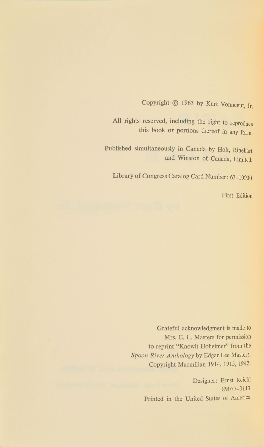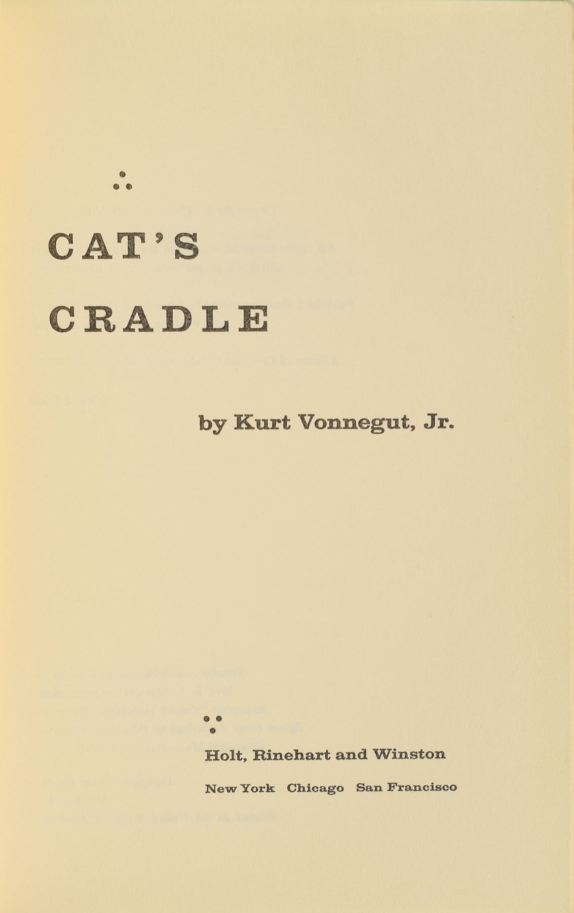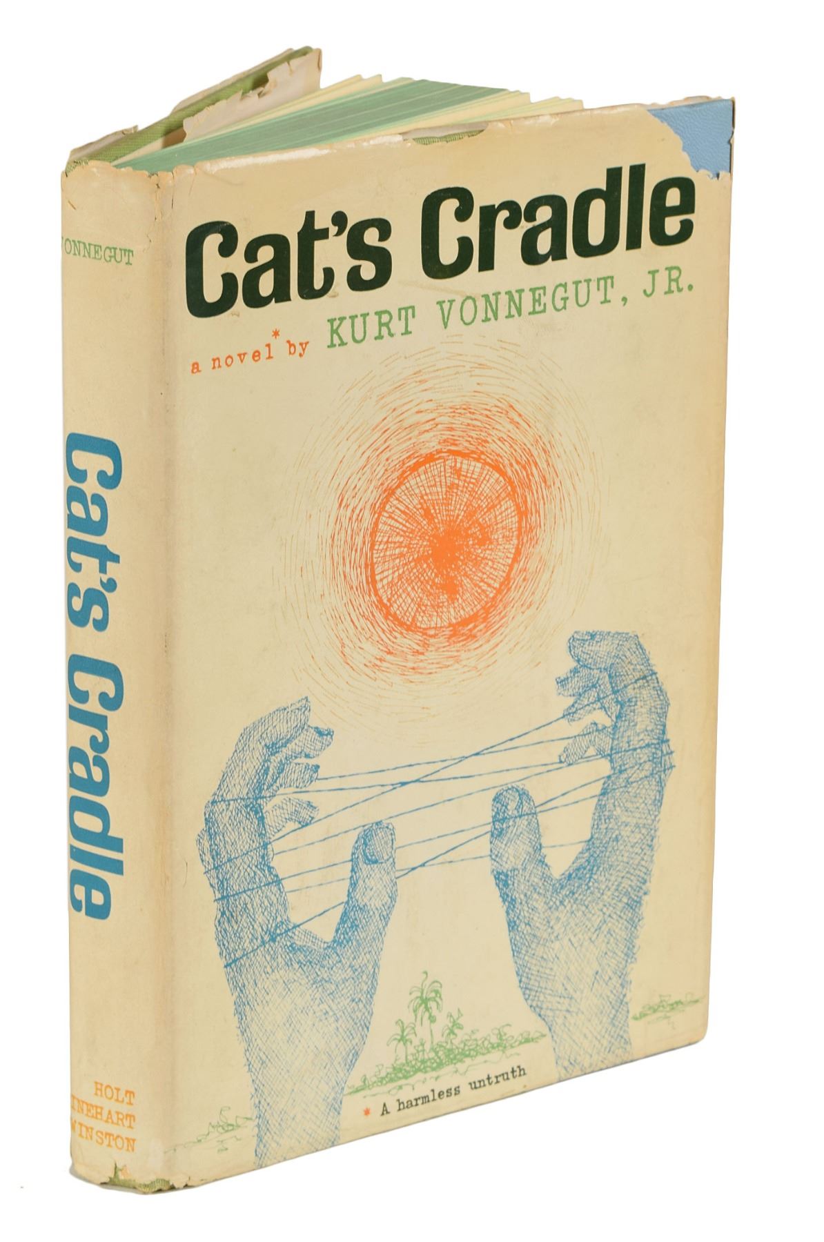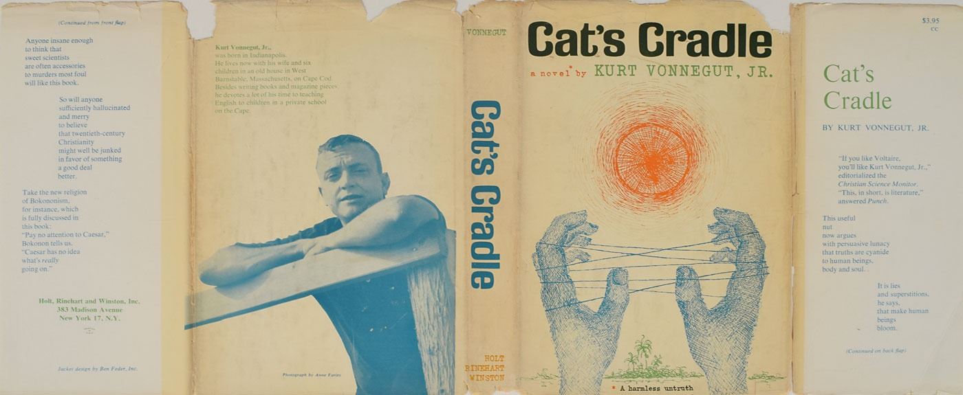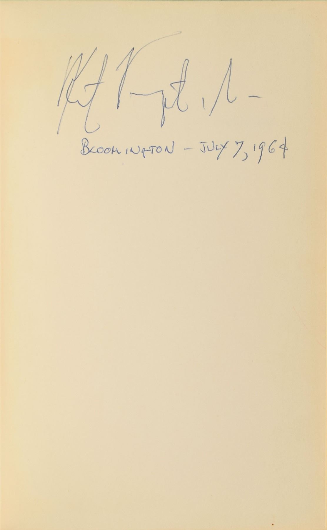 Signed book: Cat's Cradle. First edition. NY: Holt, Rinehart and Winston, 1963. Hardcover with dust jacket, 5.75 x 8.5, 233 pages. Signed on the first free end page in blue ballpoint, "Kurt Vonnegut, Jr., Bloomington—July 7, 1964." Autographic condition: fine. Book condition: VG/VG-, with several chips to the dust jacket.