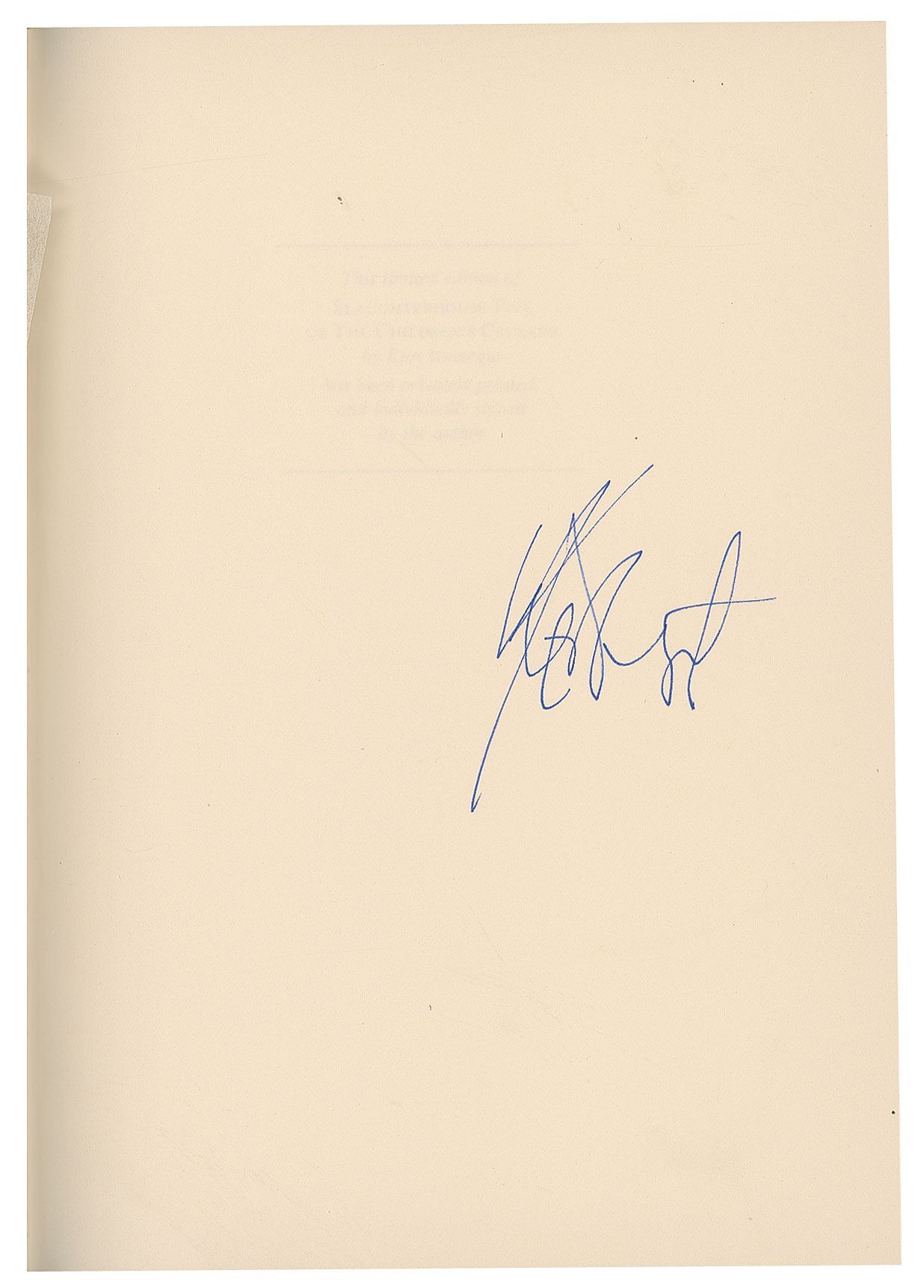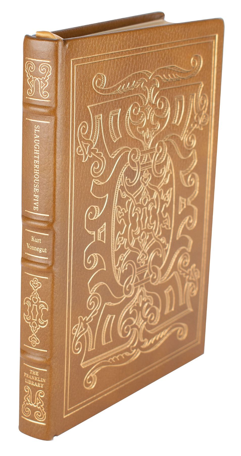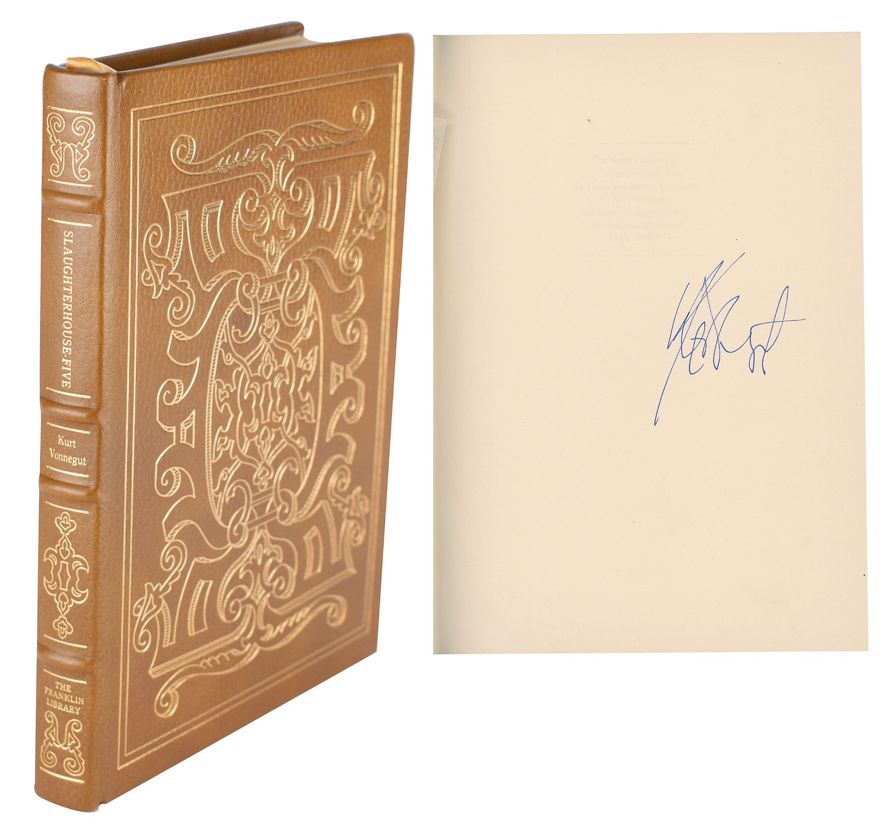Signed book: Slaughterhouse Five. Limited edition. Franklin Center, PA: The Franklin Library, 1978. Leatherbound hardcover, 6.5 x 8.75, 173 pages. Signed on the colophon in blue felt tip by Kurt Vonnegut. In very fine condition.