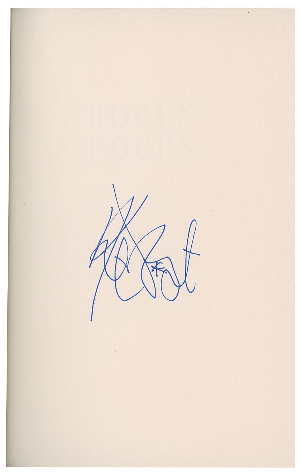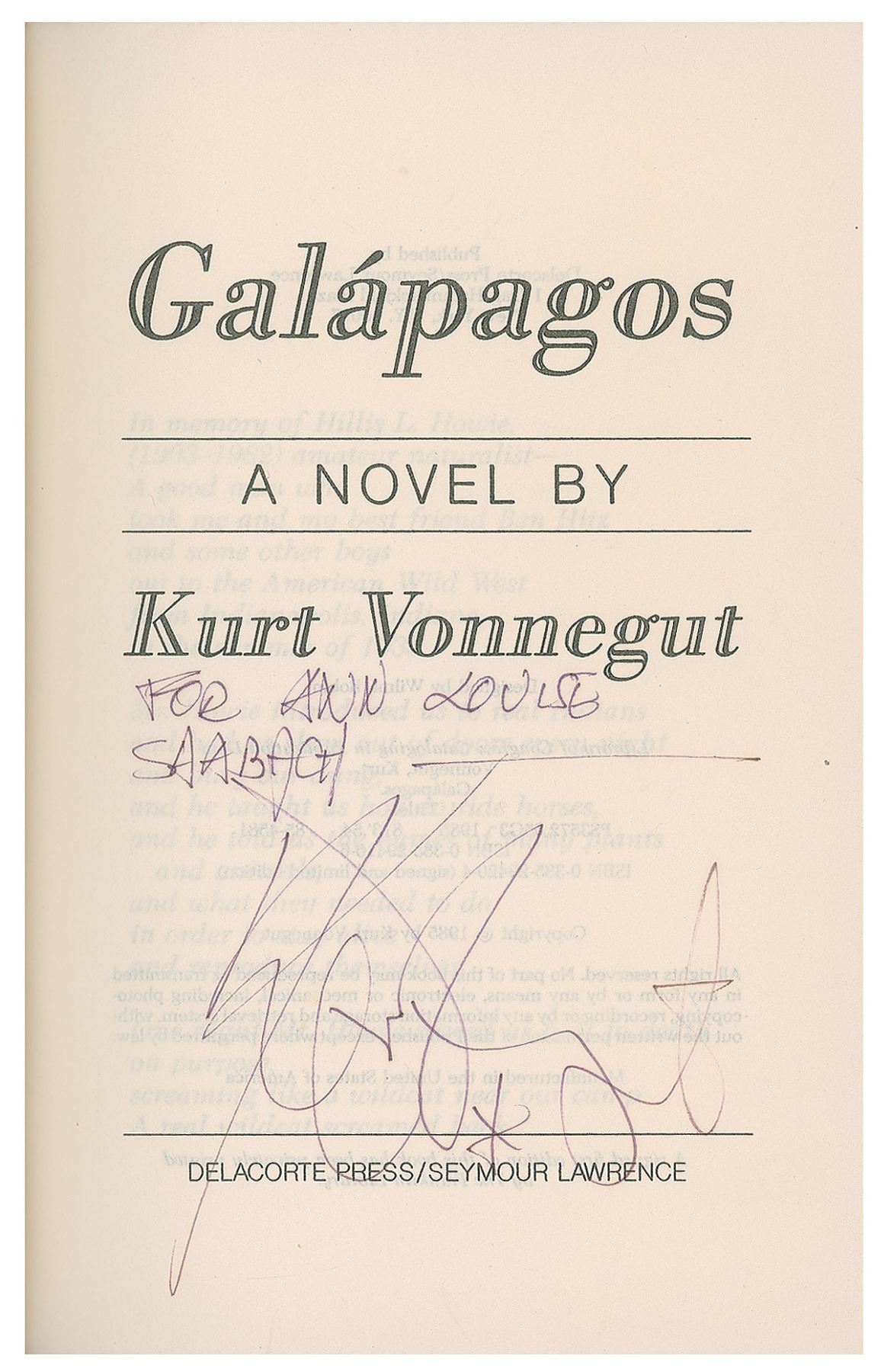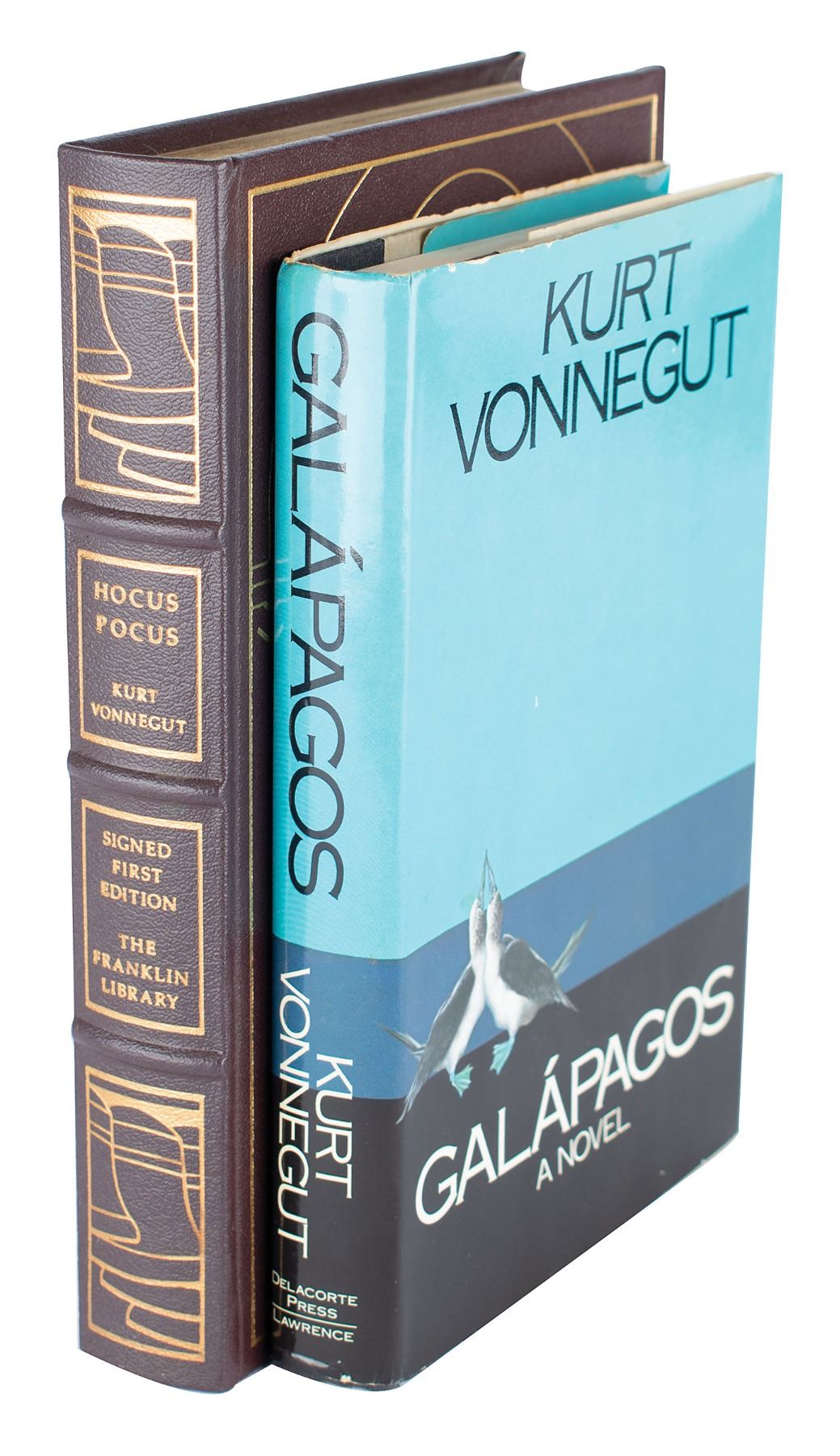 Two books: a later printing of Galapagos published in 1985 by Delacorte Press, hardcover with dust jacket, signed and inscribed on the title page in black felt tip by Vonnegut; and a leatherbound limited first edition of Hocus Pocus, published in 1990 by The Franklin Library, signed on the colophon in blue felt tip by Vonnegut. In overall fine condition.