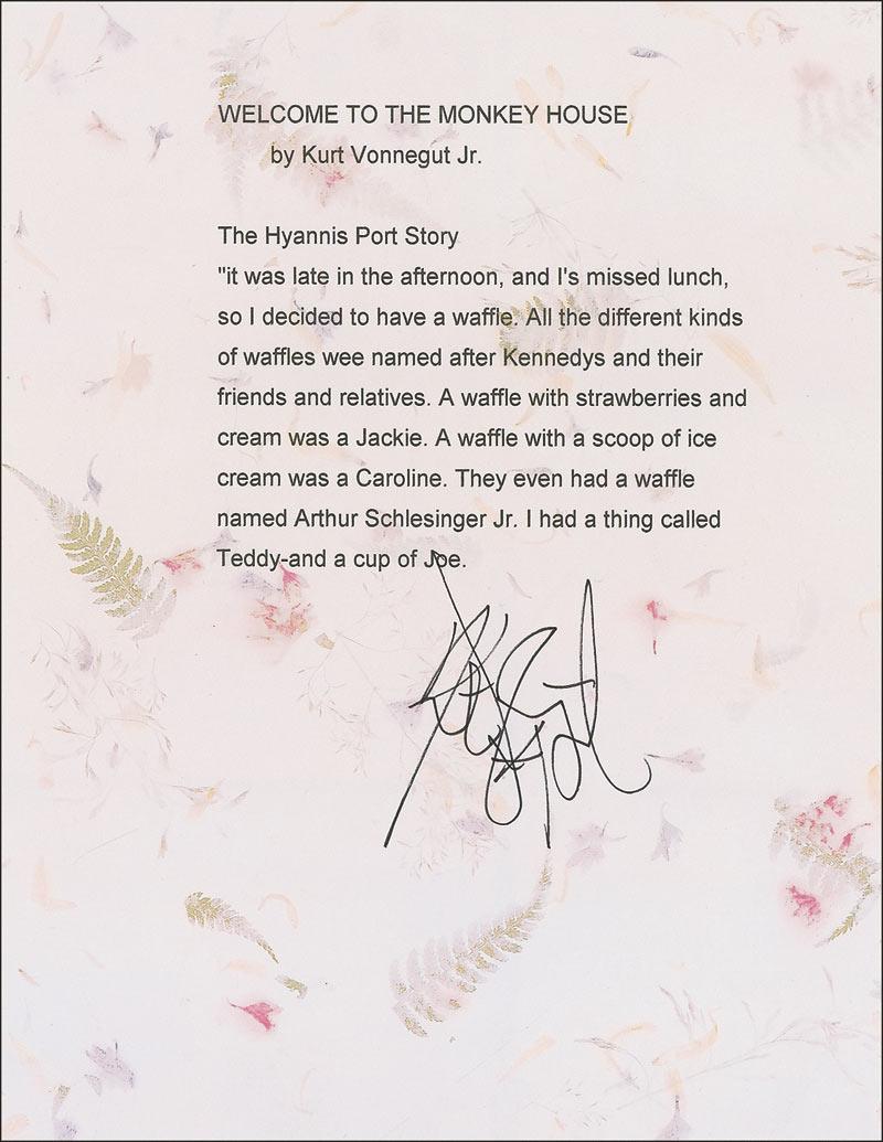 Souvenir typescript, signed at the bottom in black felt tip, “Kurt Vonnegut,” one floral design page 8.5 x 11. The opening of “The Hyannis Port Story” from Welcome to the Monkey House, beginning: “It was late in the afternoon, and I’s missed lunch, so I decided to have a waffle. All the different kinds of waffles were named after Kennedys and their friends and relatives. A waffle with strawberries and cream was a Jackie. A waffle with a scoop of ice cream was a Caroline. They even had a waffle named Arthur Schlesinger Jr. I had a thing called Teddy and a cup of Joe.” In fine condition.