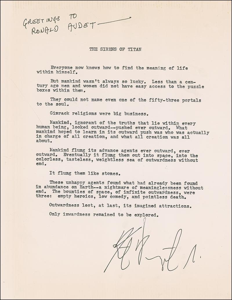 Souvenir typescript, one page, 8.5 x11, of the opening of The Sirens of Titan, beginning, “Everyone now knows how to find the beginning of life within himself.” Inscribed at the top, “Greetings to Ronald Audet,” and signed at the bottom “Kurt Vonnegut.” Some scattered light creasing and toning, otherwise fine condition.