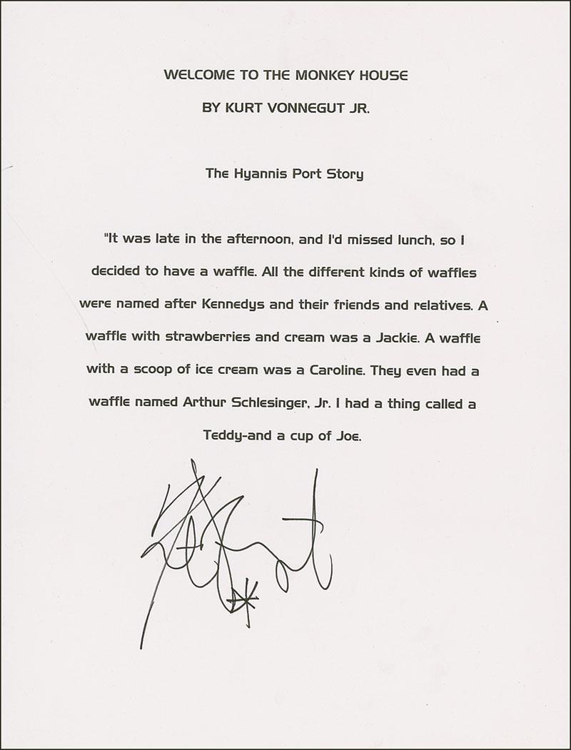 Souvenir typescript, frenetically signed at the bottom in black felt tip, “Kurt Vonnegut,” one page 8.5 x 11. The opening of ‘The Hyannis Port Story’ from Welcome to the Monkey House, beginning: “It was late in the afternoon, and I’d missed lunch, so I decided to have a waffle. All the different kinds of waffles were named after Kennedys and their friends and relatives. A waffle with strawberries and cream was a Jackie. A waffle with a scoop of ice cream was a Caroline. They even had a waffle named Arthur Schlesinger Jr. I had a thing called Teddy—and a cup of Joe.” In fine condition.
