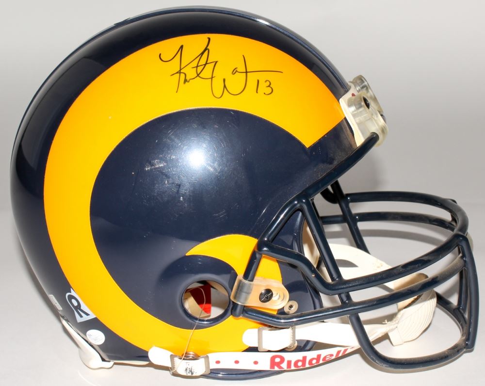 Riddell Rams full-size authentic on-field helmet has been hand-signed in blue felt-tip pen by Kurt Warner (Cardinals).