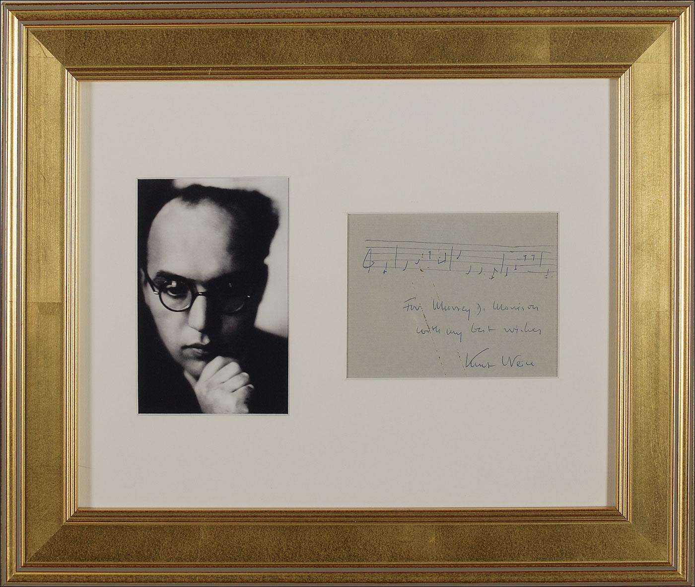 Eminent German-American composer (1900–1950) best known for such evergreen stage works as the Threepenny Opera, Mahagonny, and Knickerbocker Holiday. A number of his songs, including ‘Mack the Knife’ and ‘September Song,’ take a place among the most durable standards of the 20th century. AMQS on a light gray 5.25 x 4 sheet. Weill pens five bars of music from ‘My Ship’ from the hit Broadway show Lady in the Dark, inscribing under the quote, “For Murray D. Morrison, with my best wishes, Kurt Weill.” Archivally matted and framed with a portrait of Weill to an overall size of 17.5 x 14.5. Two thin strips of toning through portion of inscription and one bar of quote, otherwise fine condition. In 1941 Weill collaborated with Ira Gershwin (lyrics) and Moss Hart (book) for Lady in the Dark, which starred Gertrude Lawrence, and featured ‘My Ship.’ A crisply-penned quote from one of his most popular songs.