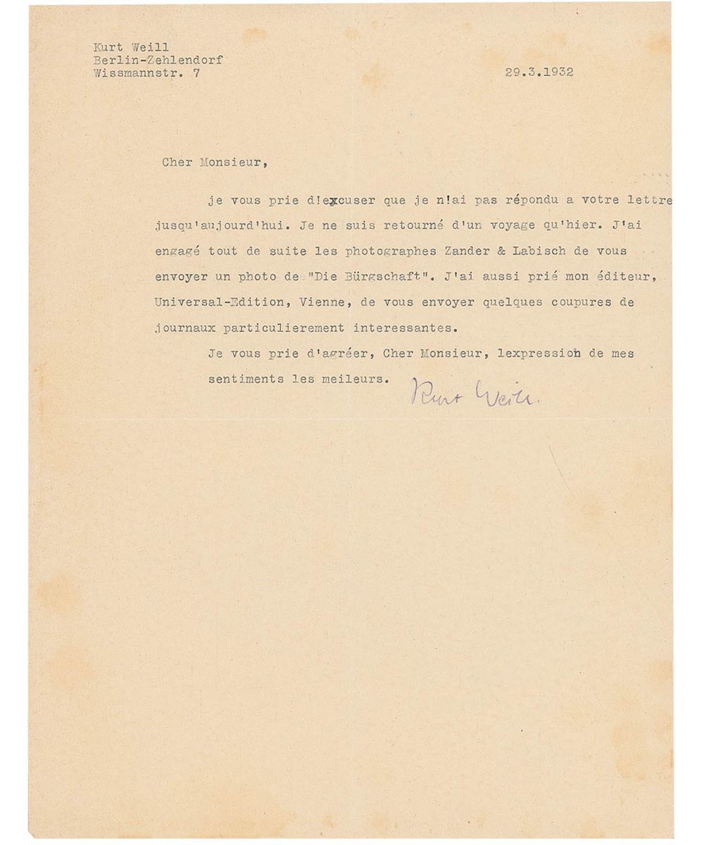 Eminent German-American composer (1900–1950) best known for such evergreen stage works as the Threepenny Opera, Mahagonny, and Knickerbocker Holiday. A number of his songs, including ‘Mack the Knife’ and ‘September Song,’ take a place among the most durable standards of the 20th-century. TLS in French, one page, 8.5 x 11, March 29, 1932. Letter to an unidentified gentleman. Translated in full: “I pray you to excuse me not to have answered your letter till today. Only yesterday have I returned from a trip. I have asked immediately the photographers Zander & Labish to send you a photo of ‘Die Bürgschaft.’ I have also asked my publishers ‘Universal-Edition’ in Vienna, to send you some newspaper cuttings that are especially interesting.” Central horizontal and vertical fold, and some scattered light toning and wrinkling, otherwise fine condition.