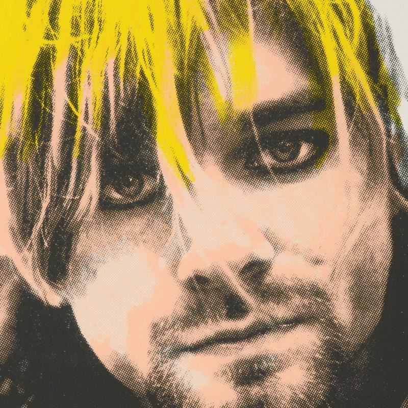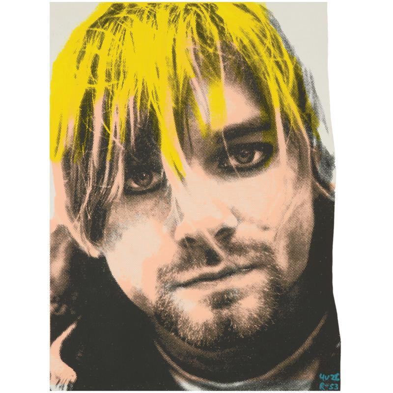 "Kurt's Music Notes (Cobain)" is a one-of-a-kind hand-painted mixed media on canvas by Ringo (Daniel Funes) - protege of Andy Warhol's apprentice, Steve Kaufman. This piece is hand signed by the artist and Includes Certificate of Authenticity. This piece comes from the Andy Warhol Legacy Series. Due to the nature of the canvas these, pieces will need to be mounted for framing. Measures approx. 12" x 16" (image). Please note: the right vertical border of the canvas was not cut on a precise right angle. As a result, the bottom corner where the signature is located laterally protrudes slightly further out than the top-right corner.
