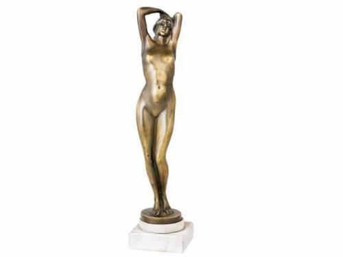 Cast bronze with patina on marble base. Signed on the base: Kurtapataky. Size: 49 cm
