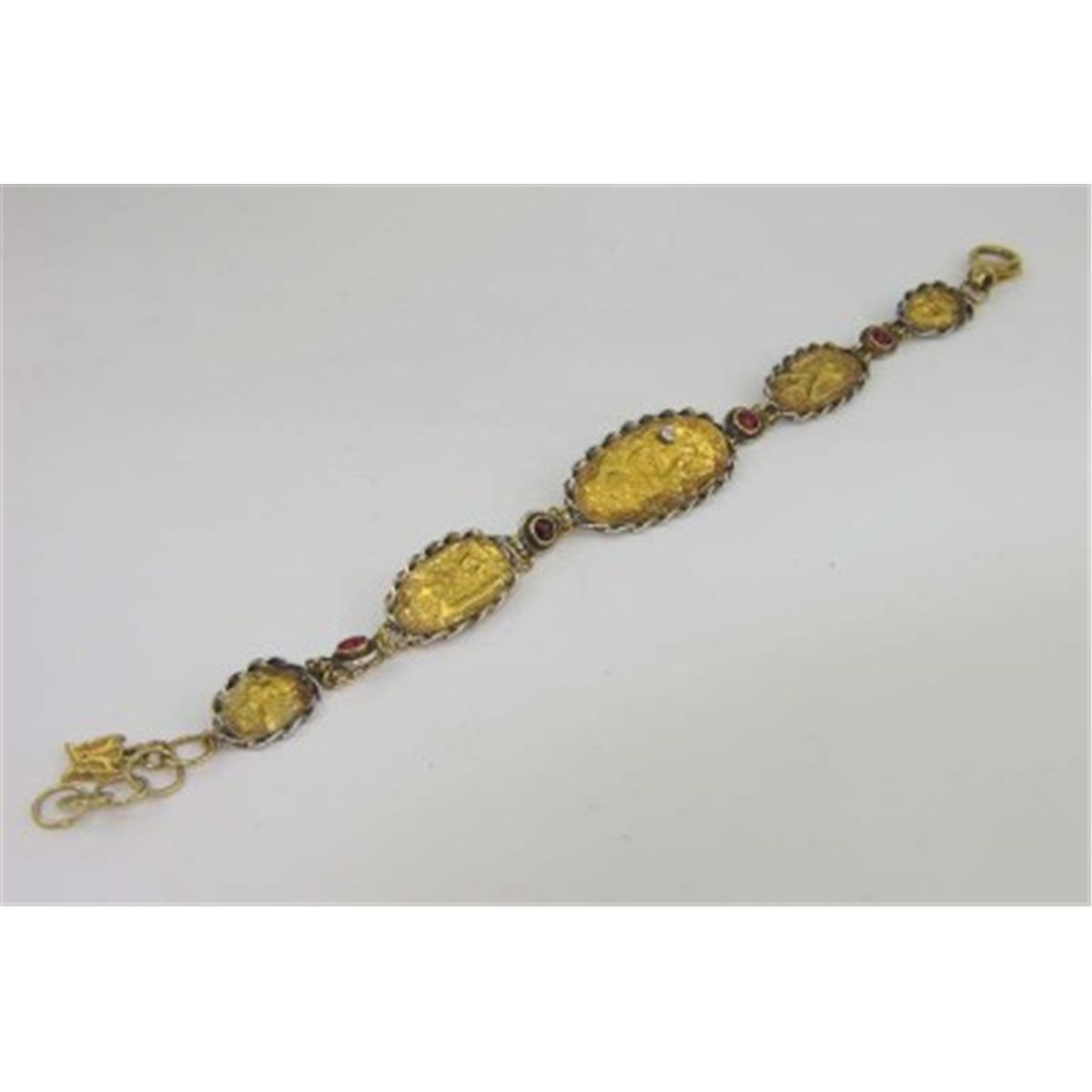 Kurtulan 24K Yellow Gold / Silver Ruby & Diamond Bracelet.The total bracelet's weight is 25.9 grams.The weight of diamond is approximately 0.03 pts, H color and VS clarity.The total weight of Ruby: 0.6 cts. approximately.The lenght of the bracelet is 8.5" inches long.The bracelet is 10 - 16 mm wide.