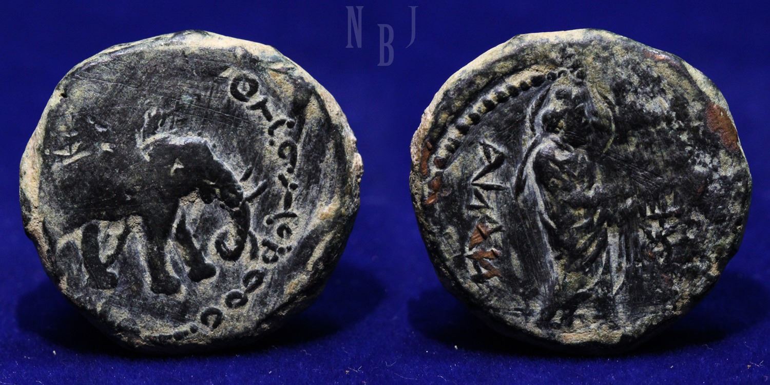 Kushan Empire: Huvishka (ruled c. 155-190 AD), AE Tetradrachm. Obverse: King holding ankush and seated on elephant standing right, with Bactrian legend around. Reverse: Goddess Ardokso standing right, tamgha to right; Bactrian legend to left. (15.97gm, 27mm) Very Fine. Some Sand Patina.