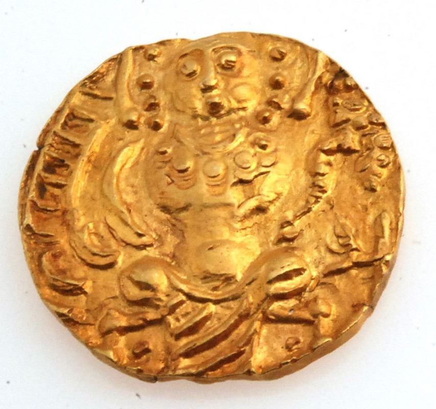 Kushan Kingdom, Gold Coin Late Kushan Period Shaka 8.00 grams / 25.25-24.60x2.84mm / The coin designs usually broadly follow the styles of the preceding Greco-Bactrian rulers in using Hellenistic styles of image, with a deity on one side and the king on the other. Kings may be shown as a profile head, a standing figure, typically officiating at a fire altar in Zoroastrian style, or mounted on a horse. The artistry of the dies is generally lower than the exceptionally high standards of the best coins of Greco-Bactrian rulers. Continuing influence from Roman coins can be seen in designs of the late 1st and 2nd century CE, and also in mint practices evidenced on the coins, as well as a gradual reduction in the value of the metal in base metal coins, so that they become virtual tokens. Iranian influence, especially in the royal figures and the pantheon of deities used, is even stronger.[2] Under Kanishka the royal title of "King of kings" changed from the Greek "??S????S ??S???O?" to the Persian form "?AONANO?AO" (Shah of Shahs