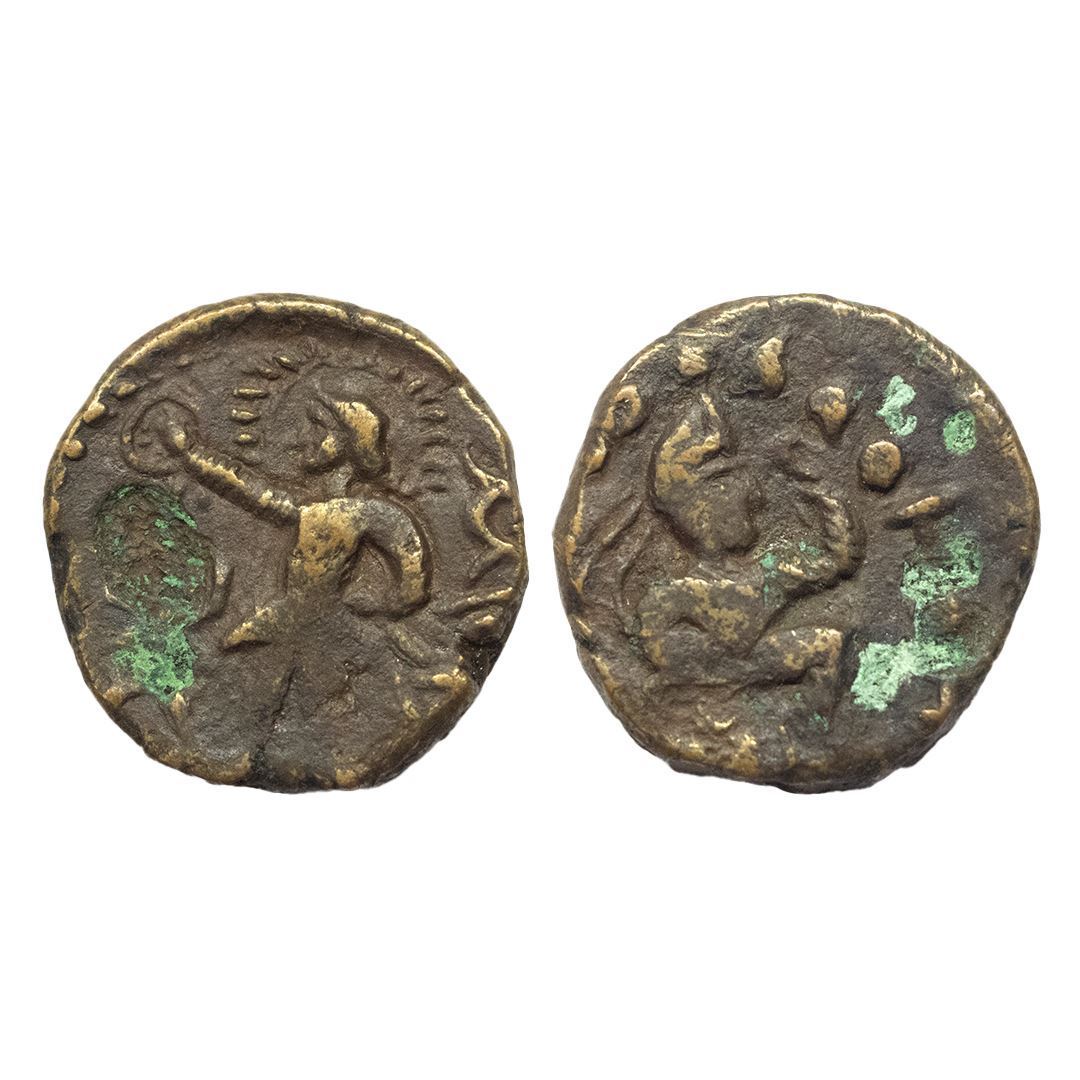Kushanas, Huvishka, Copper ½ Drachma, 7.49Grms, Obv: King seated on mountain with cross-legged, holding staff on left hand and right hand on waist, Rev: Radiate goddess MAO standing facing to left side, Tamgha on left field and label on right field. (Jongeward, Cribb& Donovan # pl. 27).Fine+.
