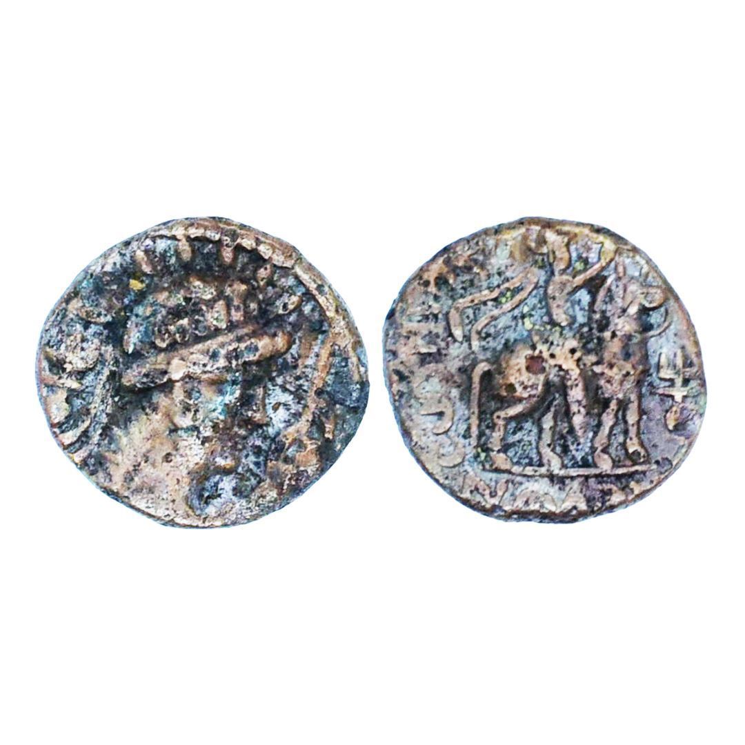 Kushanas, SoterMegas alias WimaTakto, Copper Drachm, 7.95Grms, Obv: Bust of the Kushan ruler to right wielding a spear in front of his face and behind monogram, Rev: The king mounted on a horse to right with Kharoshti legend around and monogram front of horse. (Pieper # 1736).Fine.