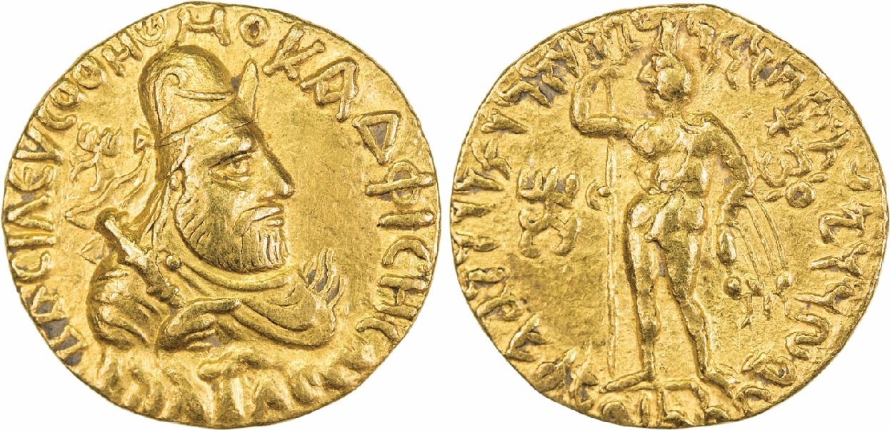 Kushanas, Vima Kadphises, Gold Dinar, 7.99g, Obverse: bust of the king facing right, wearing diadem and domed crown, emerging from the clouds, holding mace-scepter in right hand, flames emerging from left shoulder, tamgha in left field, legend BACILEYC OOH MO KADFICHC around. Reverse: Ithyphallic Shiva standing facing head left, holding composite trident with axe in right hand, he-goat skin draped over left arm, tamgha to left, Buddhist triratana (“Three Jewels”) to right with Kharoshthi legend Maharajasa rajadirajasa sarvaloga isvarasa mahisvarasa hima kaphthisasa tradara(sa) around (Gobl 18). About Extremely Fine, Very Rare.