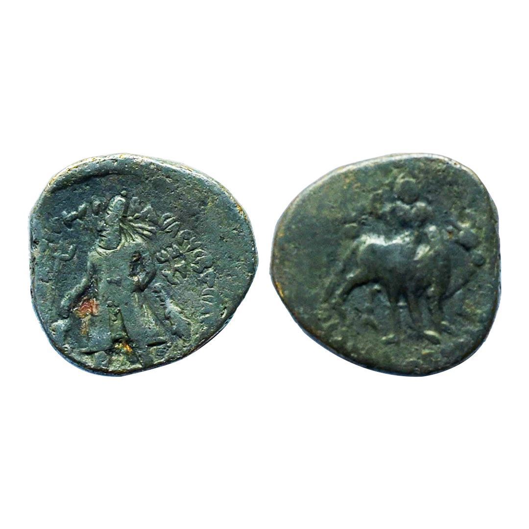 Kushanas, WimaKadphises (c. 100-127/8 AD), Copper Tetradrachm, 16.52Grms, Bilingual type, Obv: King standing facing head left, sacrificing over altar, trident on left and Tamgha on right field around Greek legend around, Rev: Shiva standing facing, holding trident and diadem in front of nandi and around Kharoshthi legend. (Pieper # 1743).Fine+.
