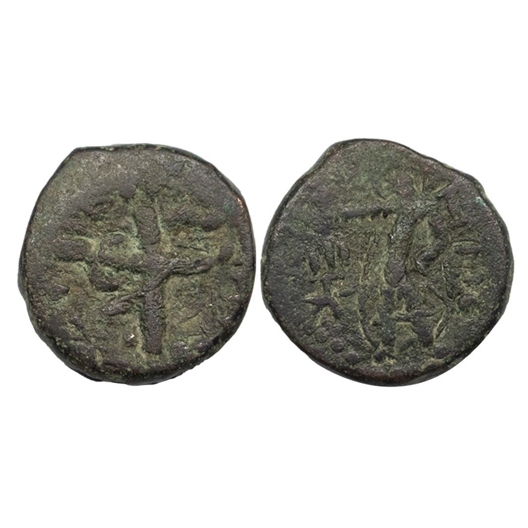 Kushans, Huvishka (c.155-190 AD), Copper Unit, 13.81Grms, OBV: King facing to left side, reclines with right foot on conch that has elephant head legs, right hand on hip and traces of Greek legend, REV: Mao standing facing to left side with crescent, clasps hilt of sword with left hand on hi[, tamgha on left side and label ‘MAO’ on right field. (Jongeward, Cribb & Donovan # 902). Fine.