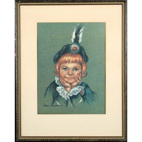 A portrait of a young child set on a dark green backdrop. The original painting was on a much textured surface and the print caught all that detail beautifully. The child has blue eyes and strawberry blonde hair, resting head in hands and smiling intently at the viewer. This stunning print is in very good condition and is placed in an ivory colored mat that flatters the colors of the print. The frame is slender and is a dark brown color trimmed with gold. The print measures 15.5? x 11.75? and is a total size of 24? x 19? including the frame.