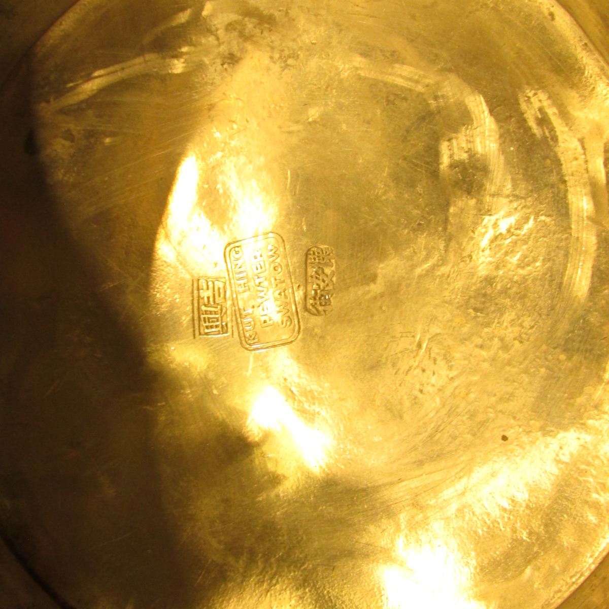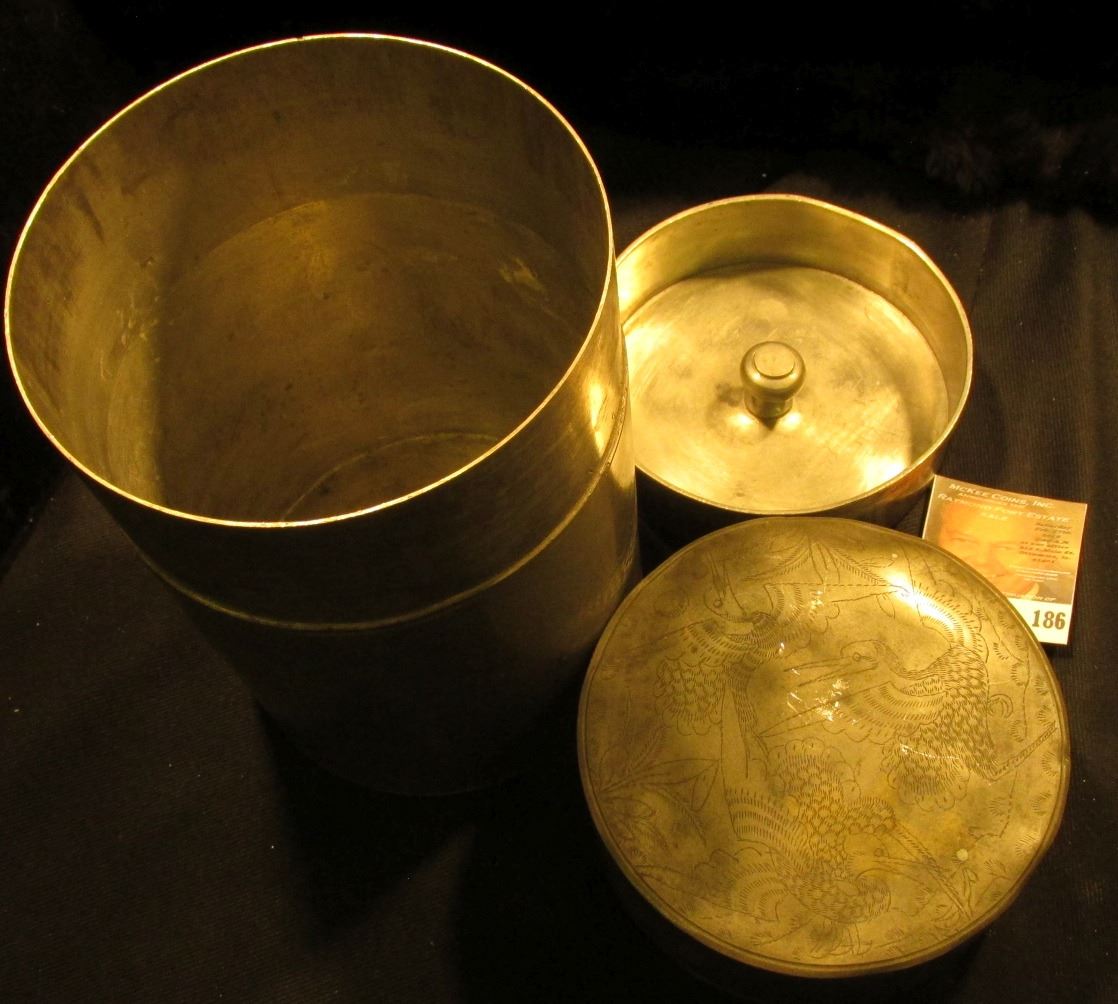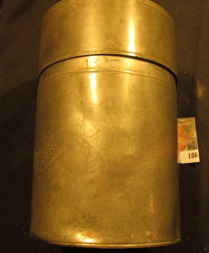 "Kut Hing Pewter Swatow" Heavy Canister with engraved exotic Bird on top and ornate Chinese Dragon on side.